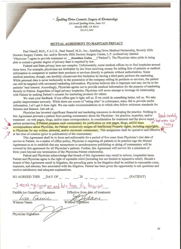 I do not want Paul Nassif for a corrective surgery (after he did the surgery on me): 1-who does not admit of doing certain things in his standards of care practices I received, 2-threatens to sue me, 3-violates my rights by disclosing my information/findings to his lawyer, 4-lied to me for his own benefit, 5-makes me sign multiple legal documents (including ‘‘Gag Contracts’’ and Physician-patient arbitration agreements), 6-Tries to stifle my rights of expression on the internet using ''Gag Contracts'', 7-put me in a trap for his own benefit, 8-deceived me for his own benefit, 9-gave me poor results (and he denies that), 10-and who made me feel like a bank account rather than a patient.