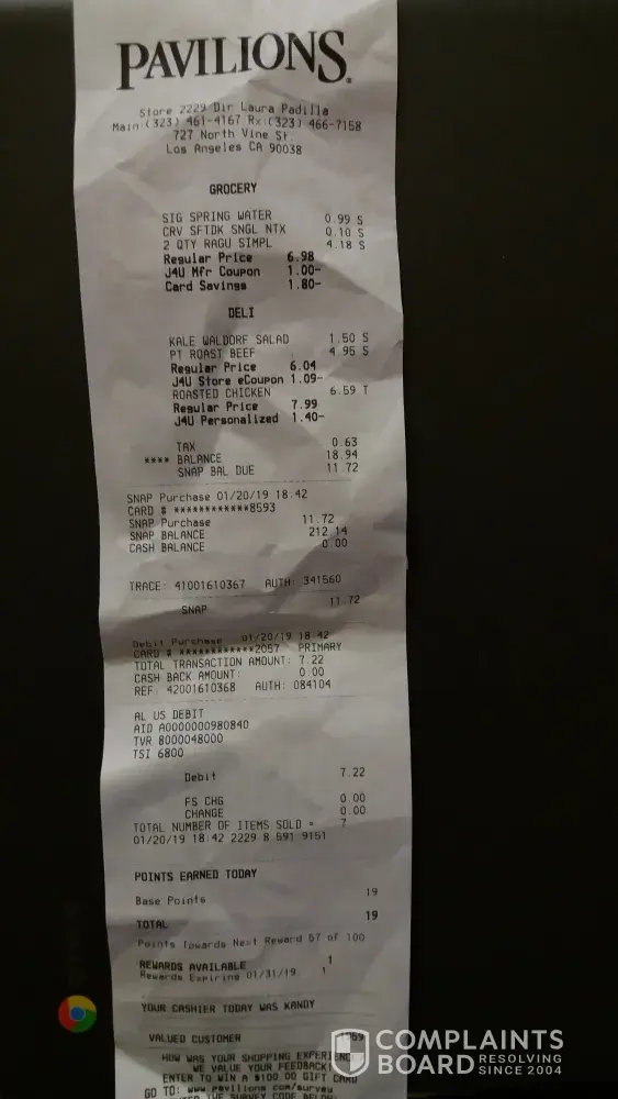 Date on incident: January 20, 2019; Time: 18:42; My membership # [protected] Hello, this evening I shopped at my regular Pavilions store which is located at 727 N. Vine St., Los Angeles, Ca 90038. My visit was fine until I went to check-out with cashier Kandy. I had explained to her that I needed to have bread that I was trying to check-out under a...