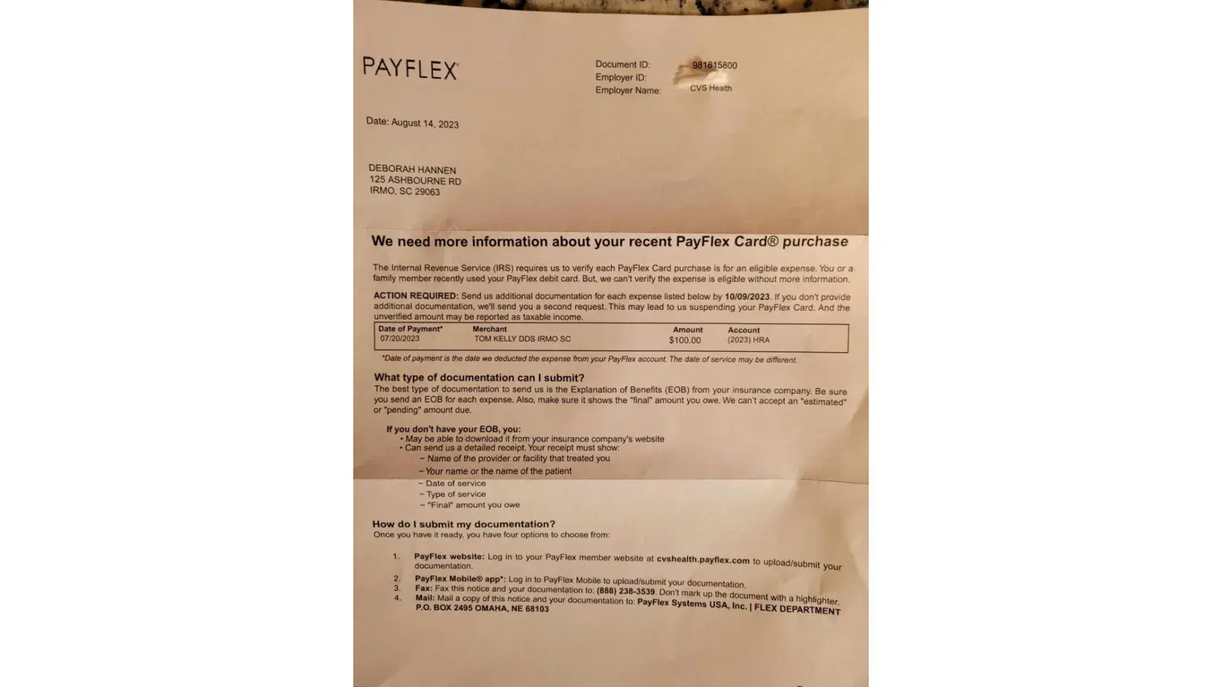 I submitted the full bill from my dentist for the $800.+ crown I was having done. I didn't have dental insurance at the time. I paid for it with Care Credit. Apparently having the bill showing how much I had to pay wasn't good enough because the bill also had words like 'estimated' or 'pending'. I submitted several times online and I also faxed. I got nowhere. So when I went back to the dentist for the crown placement (first visit was the temp crown), I paid $100.00 of the remaining balance with the PayFlex card. It went through, no worries. Over a month later I get a letter stating "The IRS requires us to verify...purchase is for an eligible expense." I have to send additional info (same stuff I've sent several times already that they rejected) or they will report to the IRS that the $100. is taxable income. WTAF is wrong with these people? I will never, ever use PayFlex again.
