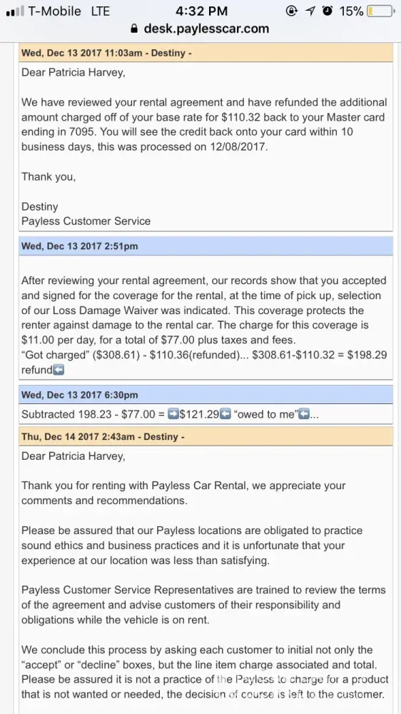 I booked with Payless car rental through the Orbitz website. My total cost with all taxes and fees included was $94.80. Ended up being charged $143.88 3 days after I returned home from my trip. They accept charges for you to acquire and are deceitful and pushy. I would be ashamed to work for this scam job. Can't even call it a business. They have done this to thousands of people all across the country. I never thought to even look at reviews, but I should have and will never rent from them again or any sistering company's. Declined all extras and insurance, returned car with full tank of gas, cleaned the inside and didn't damage the outside. No reason for an overcharge. I would like my money back! This company needs to be shut down. Have documented proof of everything and still the incorrect charge.