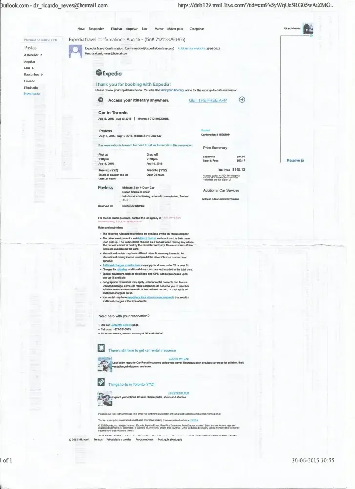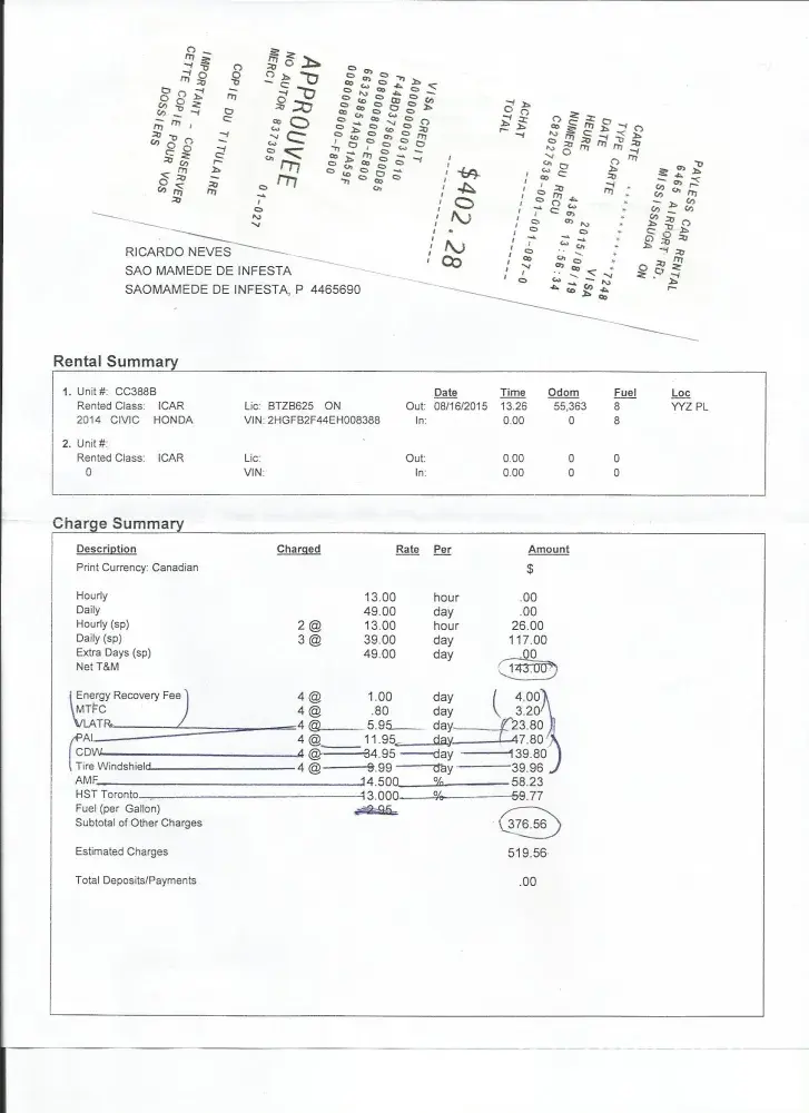 Reservation made with Expedia (Itin#[protected]) for a car in Toronto(Pearson Int Airport) for 3 days priced at 145.13 US dollars turned out in the end for a total amount of 402.28 Can dollars. First-251.36 for excess insurance that was obligatory otherwise they wouldn´t give the car (even with that I had to leave a 500 Can dollar deposit) Second-I had...