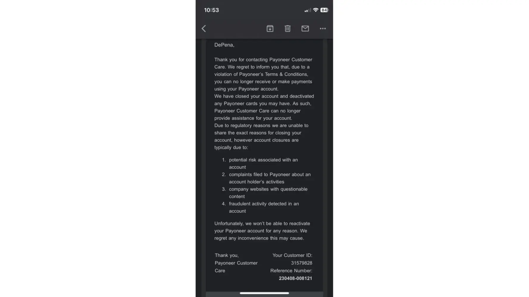 At first, I was asked to provide documents for verification in March 2023. I submitted all necessary documents (including those requested additionally). Verification eventually passed, and the documents were accepted(the Message from Account Approval Department is attached), but the transactions continued to hang. I contacted the support, and they replied that everything was fine, and should just to wait a little. By the way, it wasn't my first KYC, I'd been using Payoneer for many years, always provided all the info they needed, and passed all the checks. But then they blocked my account. I contacted support, they wrote that the account is still under review (Screen 1 attached). And then they blocked my account with all the funds. I tried to contact support many times, but they don't tell me the reason and whether they'll give my money back, they just say that I'm blocked forever. I have been using Payoneer for many years and always provided all the info they were asking for. I was not noticed in scams or forbidden activities. I've just been receiving payments from Upwork. I don't know the reason, but a lot of Ukrainian users faced the same problem with Payoneer.