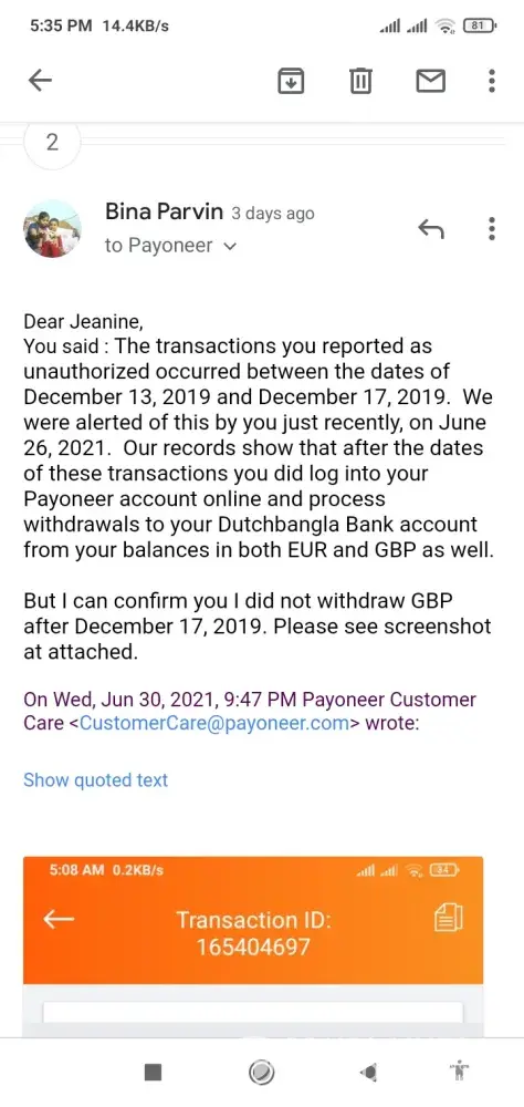 All of above details proved Payoneer Inc. did not fare investigation and they were alert ignore my refund.