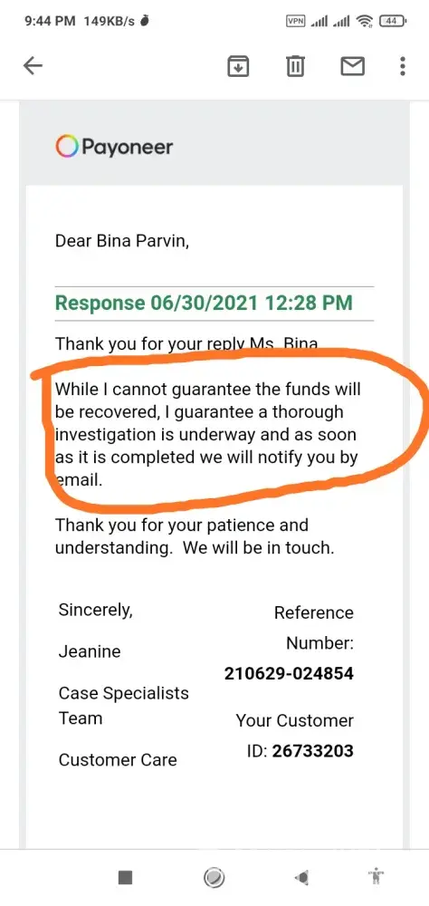 I informed to Payoneer Inc. dt June 26 2121 it's almost one year and half later.