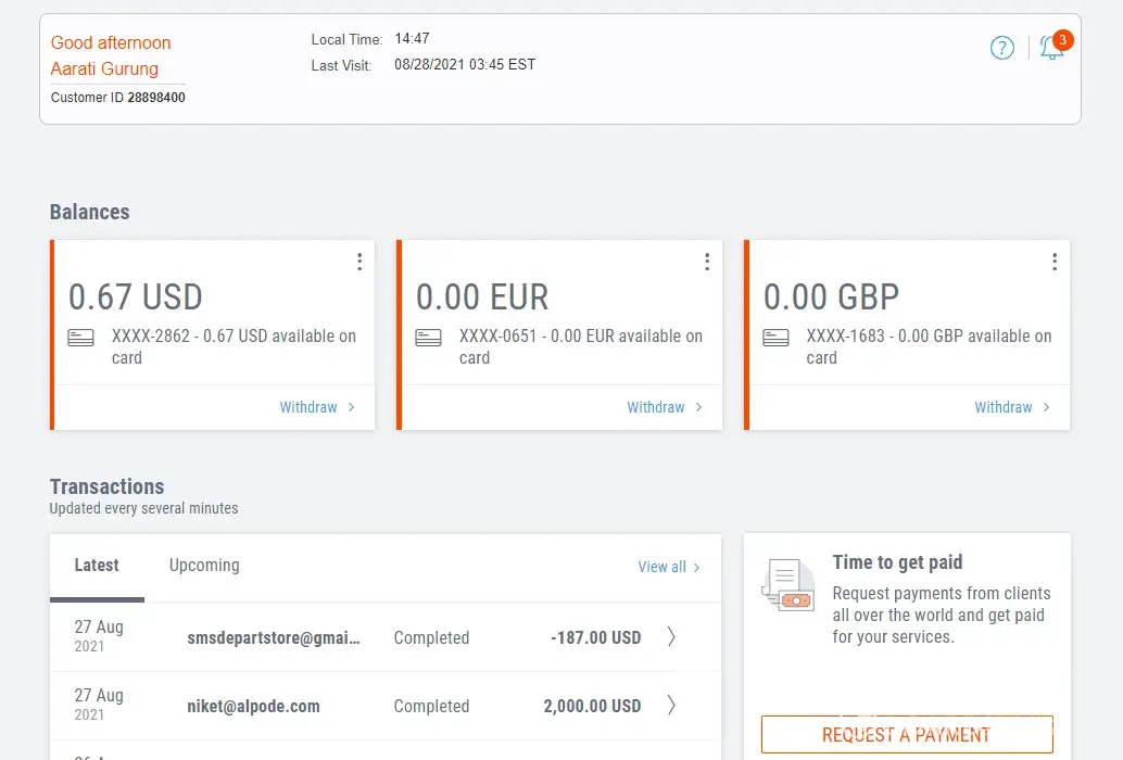 I withdrew this money in 2020 to my Skrill account because back in 2020, Payoneer asked me to do so on the grounds that they could not verify my address. After countless back and forth with proof, they reopened my account in June 2021 and issued me a new USD Mastercard, which was activated in July 2021.