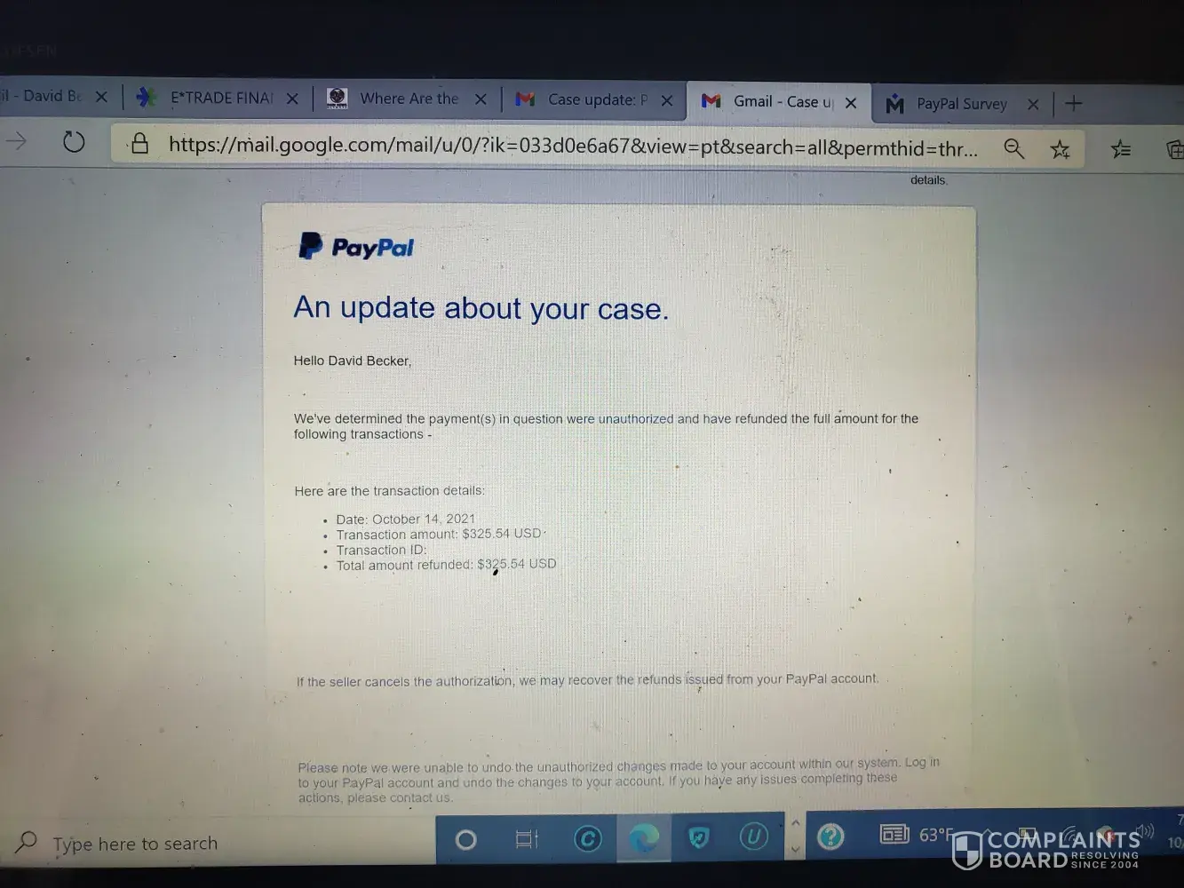 on 10/15 i filed a dispute with paypal for an unauthorized charge for $325.54. On 10/15 Paypal emailed me indicating i would be refunded the full amount. On 10/20 i spoke to Gabe at paypal who told me the refund would be in my bank by 10/22. On 10/22 i did not receive the refund in my bank. On 10/22 i spoke to Chilly Serena and Robert about the issue- and they did not resolve the issue
