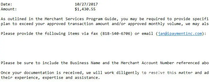 Two days after my account was setup, I received an email from jenny newman at ipaymentinc.com which said "suspended batch alert: immediate action required." if ms. Newman worked for me, she'd be fired instantly because nothing (not 1 word) in her email told what I needed to do to ‘unsuspend' the one and only $1400 charge! In fact her email said 'please provide the following items by fax or email' but listed absolutely nothing (space was 100% blank)! See screen capture of actual email from jenny newman at ipaymentinc.