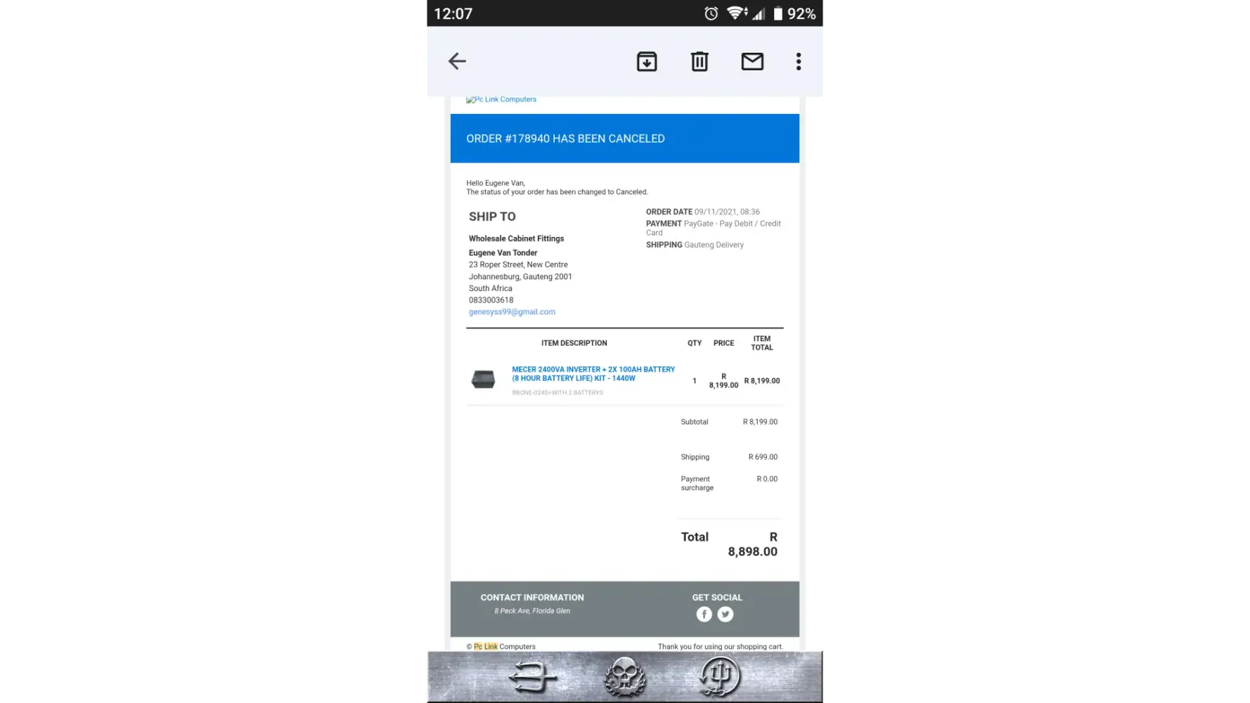 I paid R9 599.00 for an inventer and battery set on 1 December 2021 from pc link computers. I was expecting delivery in January 2022. When I sent a follow up email in January, Garth of pc links informed me that there was a delay and I will receive the order on 20 March 2022 , after 20 March I sent numerous emails to follow up on the order and they have all been ignored. Their website is now no longer working. I visited their Roodepoort offices in March and in May and the office is vacant. I need help to get a refund. It seems they are now scamming innocent people.