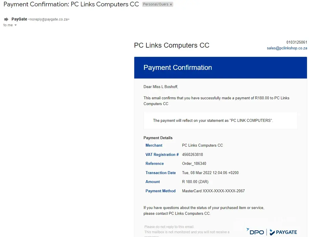 Subject: Re: [Request received] Fwd: Payment Confirmation: PC Links Computers CC