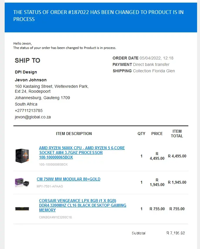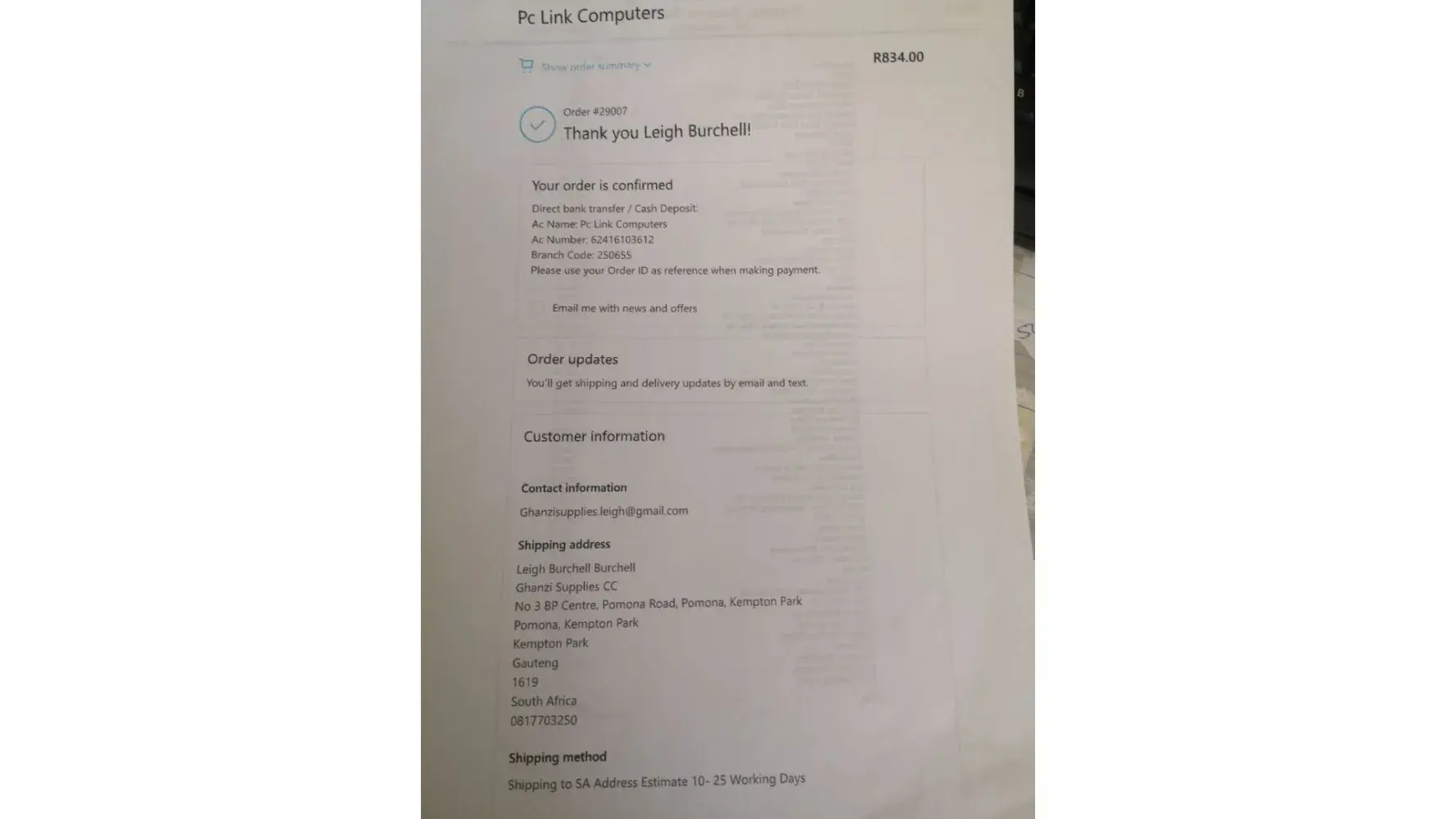The following items have been ordered from PC Link Computers CC, Florida, Gauteng. (