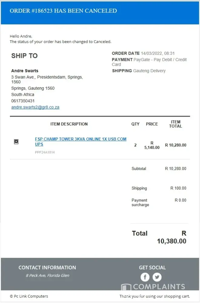 On Sunday 3 April 2022 at around 15:30 I placed an order for a Mecer 5kVA/5kW PF1 64V Charger/ 48V DC SOL-I-AX-SP64 via PC Link Computers' website. At 15:38 I received an email from the company confirming that the order has been placed and I should do an EFT for R8.350-00 being the amount due for the item. I immediately did the EFT and forwarded the proof of payment to [protected]@pclinkshop.co.za as per their email and proforma invoice/quotation. On Tuesday 5 April 2022 I sent them an email to [protected]@pclinkshop.co.za enquiring when I can collect the item at their Florida Glen address as per the order. I received no reply to my email. On 6 April 2022 at 16:49 I sent another email to [protected]@pclinkshop.co.za and [protected]@pclinkshop.co.za again asking when the item will be ready for collection. Again I did not receive any reaction. On Thursday 7 April 2022 at 12:38 I again sent an email to the two addresses mentioned before requesting cancellation of the order and a refund into my bank account and supplied the banking details. Again no reaction. On Friday 9 April 2022 at around 11:00 I visited the address of the company in Florida Glen. I only found a note on the gate stating that because of Covid19 the staff are working remotely and one should send enquiries to [protected]@pclinkshop.co.za. While at the premises two disgruntled people also arrived. The lady said she has been battling since December last year to get a refund and the other gentleman said he was looking for the product that he ordered for more than R16.000 and also do not get any reaction from the company. Checking the status of my order on the companies website it states that the order was received but payment is still outstanding. I just phoned the available telephone number of the company and just got a voice message stating that due to high call volumes they are not answering calls and one should send an email to [protected]@pclinkshop.co.za and they will respond within 48 hours.