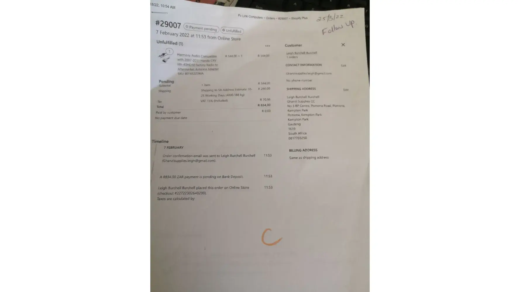 On the 17 March 2022 I try to contact PC Link Computer via phone number [protected] the phone message it to contact them via email ([protected]@pclinkshop.co.za) I have tried calling several times every day and send emails receive confirmation email with a number, but no response about my order.