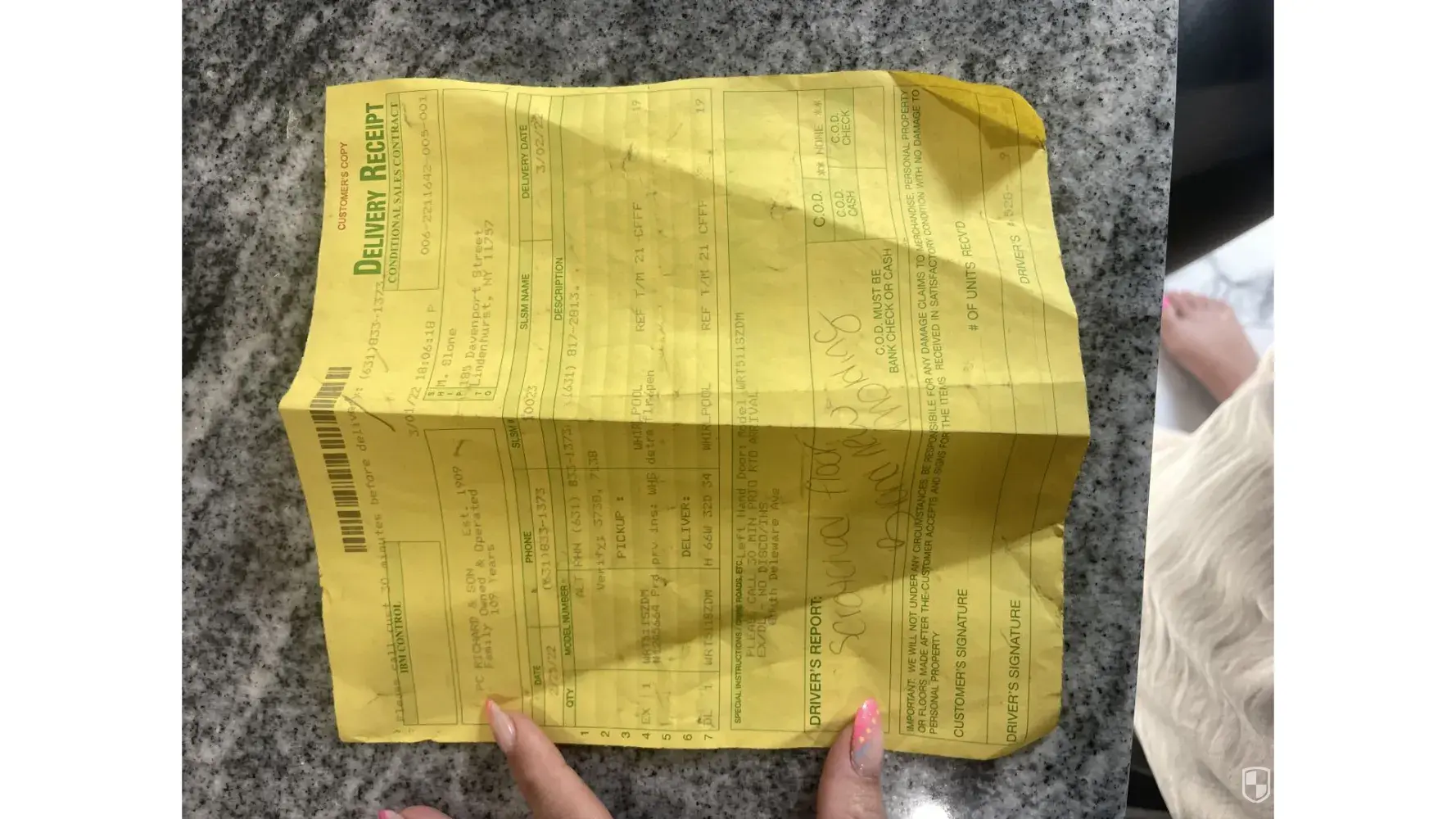 My name is Theodora Slone and I got a new fridge yesterday 3/3/2022. The two men that came did not bring a moving dolly or a moving blanket. They scratched my hardwood floor, my kitchen floor, they scratched my molding as well. I am so upset- I just did an entire remodel of my home and work very hard in my day to day life. When telling the guys they were creating damage they did not care and were unkind. They dragged the fridge out of the house and into my home as well.