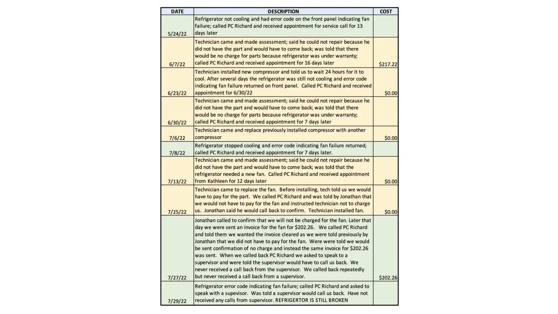 On May 24, 2022, our 7-year-old LG refrigerator stopped cooling and had an error code indicating fan failure. After more than 2 months, 6 service calls, 2 new compressor installations, a new fan installed and countless phone calls with PC Richard’s customer service department the refrigerator is still broken. We were told that after the initial service call for which we were charged $217.22 for labor we would not be responsible for parts as the refrigerator was under parts warranty. After the 6th service call we were invoiced $202.26 for a new fan even though we were told we did not have to pay for it. PC Richard’s customer service is of absolutely no help and numerous assurances that a supervisor will call us back have been a complete lie; we have never received a callback from a PC Richard supervisor ever.