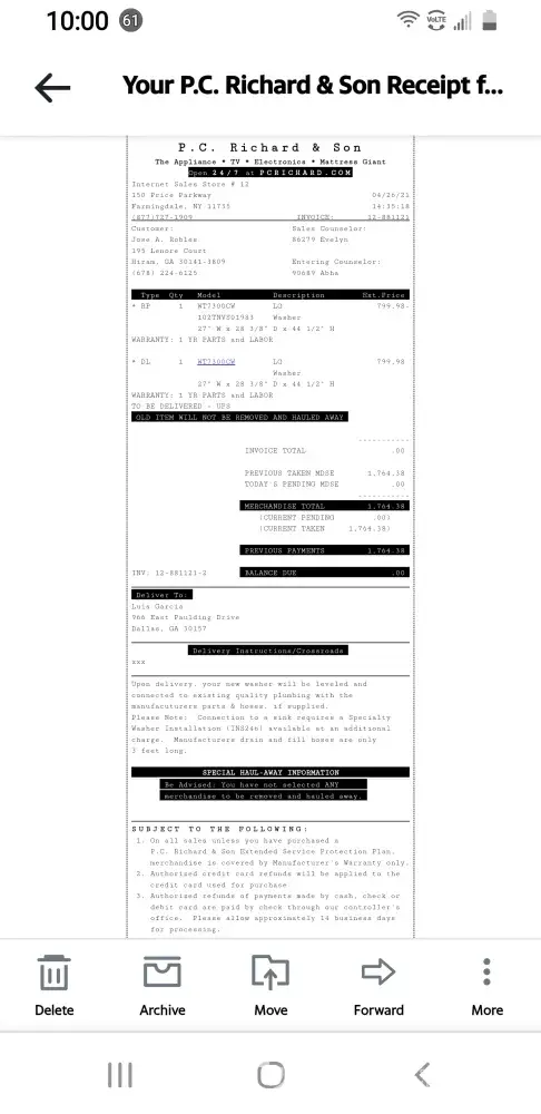 I went into the Newington, CT PC Richards store and ordered a TV on 9/4/21. I had to wait until Friday, 9/10 to have it delivered. Delivery was seamless except that there was only one delivery driver. As part of my order, I had purchased Haul Away Service and they were suppose to take my old tv. With no fault from the delivery driver, he was unable to carry and haul away my tv as there was only one person and it was too heavy for him.