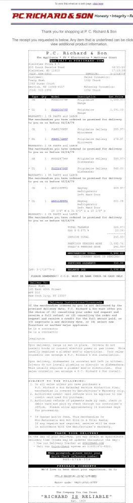 We purchased many products from PC Richards, most recently purchased outside appliances however, this is my last purchase. I would never buy anything from you again.