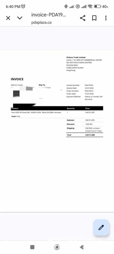 I want to warn everyone about PDA Plaza Canada. I ordered a Vivo X200 phone on July 16, 2025, and paid CAD 1,086 via Interac e-Transfer. The phone was never delivered. Despite repeated emails and calls, I have received no response, no refund, and no updates. On top of that, although I ordered through PDA Plaza Canada, the invoice came from Chikara Trade...