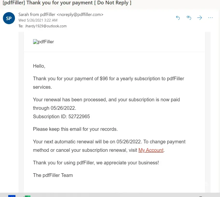 On May 26 PDFFiller withdrew $96 US from my credit account without notification. I had a free trial with the company to test out their services but hadn't decided if I wanted to purchase the subscription. I was under the impression that I would receive due notice if the free trial were to expire. I was never informed that it had expires, and was not informed that my annual trial would begin. The company simply withdrew money without consent. I never agreed to purchase the subscription. Only the free trial. I have promptly cancelled the subscription at the moment I write this, the day money was withdrawn. I do not want the features I was charged for.