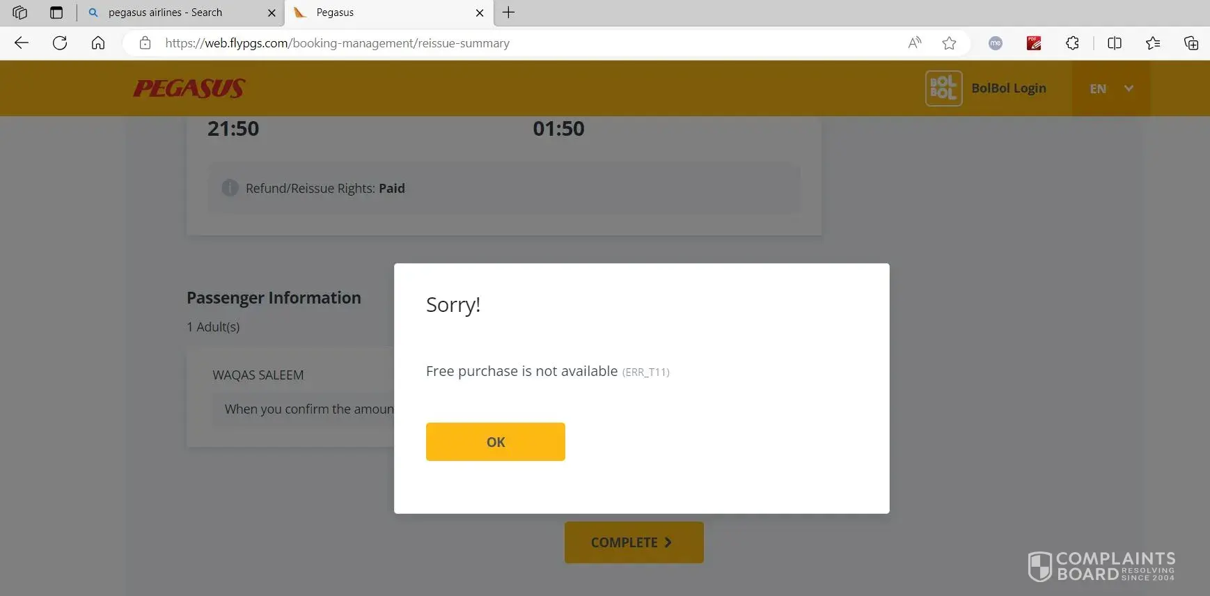 My PNR is jFVLUM Sur Name Saleem. I want to change my return flight from 27th August to 28th August (from Manchester to Dammam). I am living in Saudi Arabia right now and ticket was baught from saudi credit card. It is flexible free change date ticket. I tried to change it from manage booking on website, but in the end, it is giving me a message " Free Purchase is not available (ERR_T11)". I try to use different browsers (chrome, Microsoft edge etc.) but the issue still remains same. Please solve this issue.