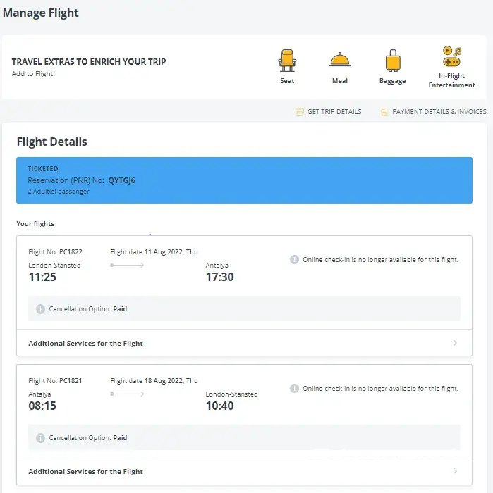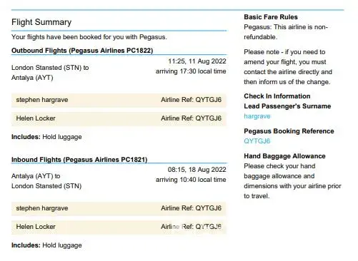 Loveholidays purchased 2 return tickets from Pegasus Airlines: Stanstead to Antalya on the 11-OCTOBER 2022, return from Antalya to Stanstead on the 18-OCTOBER 2022.