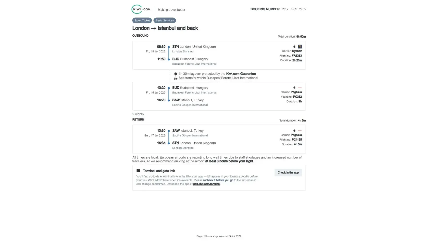 My cousin and I were booked onto flight KKTF1Y from Stansted airport to Istanbul on 13th July at 12pm.