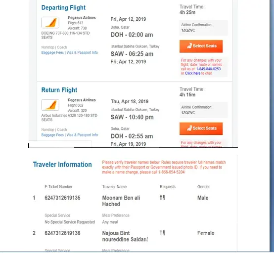I flew with my wife from Doha to Istanbul and back to Doha on board of Flight PC 602 to spend a week-holiday in Turkey. The flight details including our names are enclosed in the attached document.