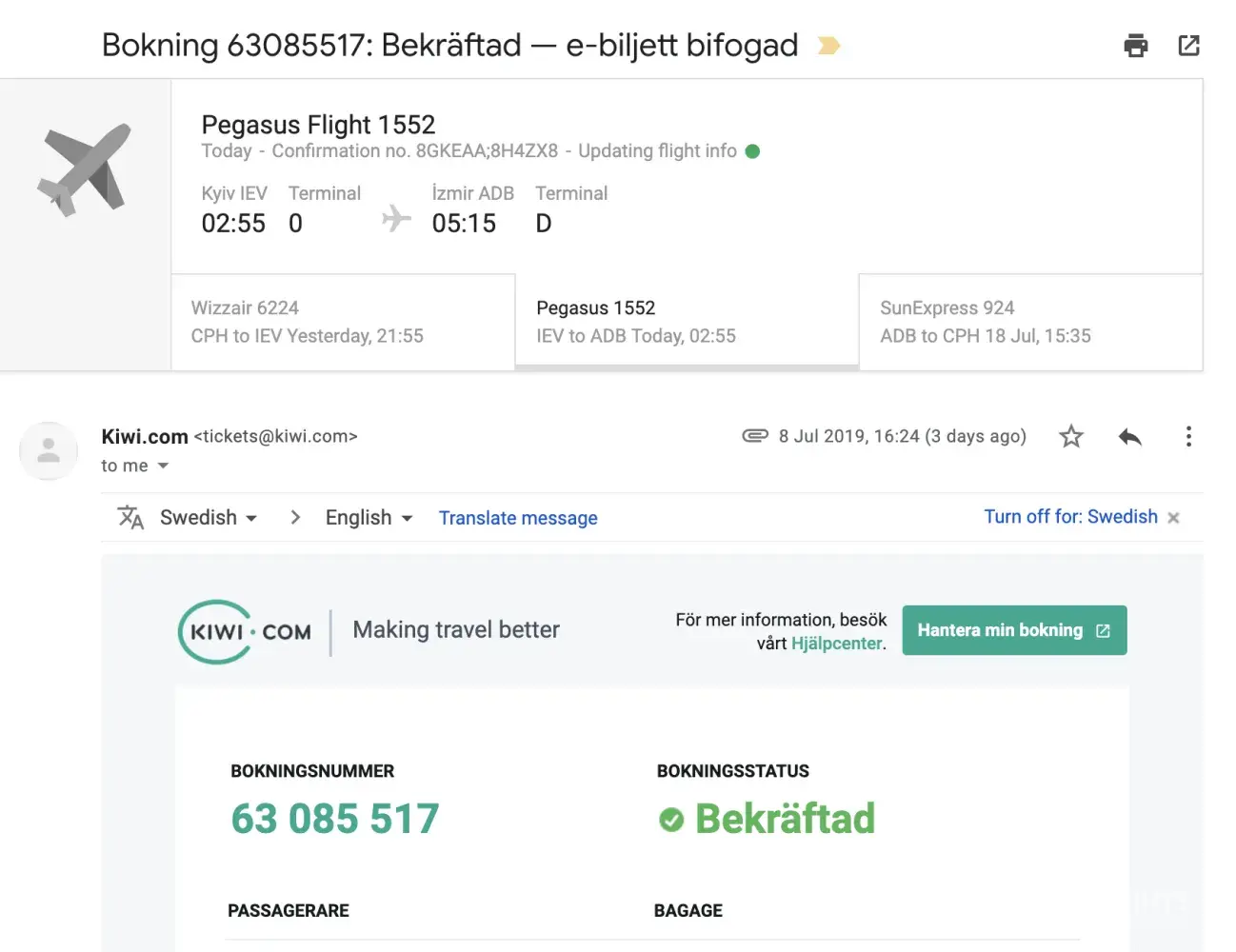 On the 10th of July, our first flight from Copenhagen to izmir took off with a stopover in Ukraine. When we arrived in the Ukraine, our luggage was late. This delayed our exit from the terminal. We finally got them around 02.25. The next flight would depart at 02.55. And it did, but without me and my brother as passengers.