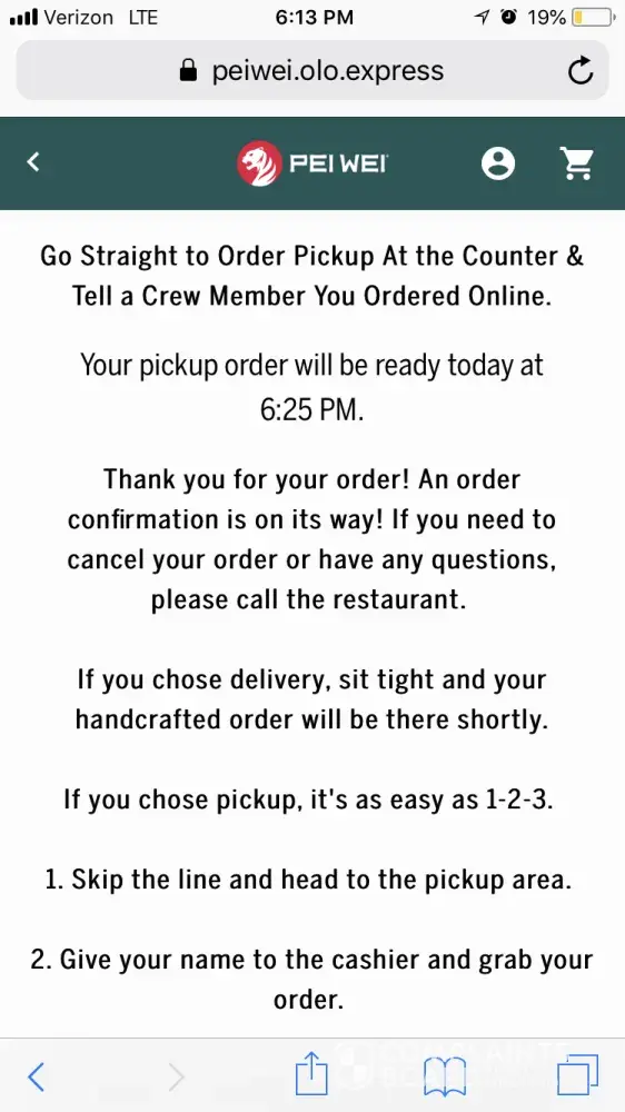I wasn’t even mad that I placed my order for pick up at 12:15pm that day and I got there around 12:25pm and I was told they were really behind on orders and it could be 25-30mins. I was offered a drink but refused since I got a Sonic drink right before getting to Pei Wei.