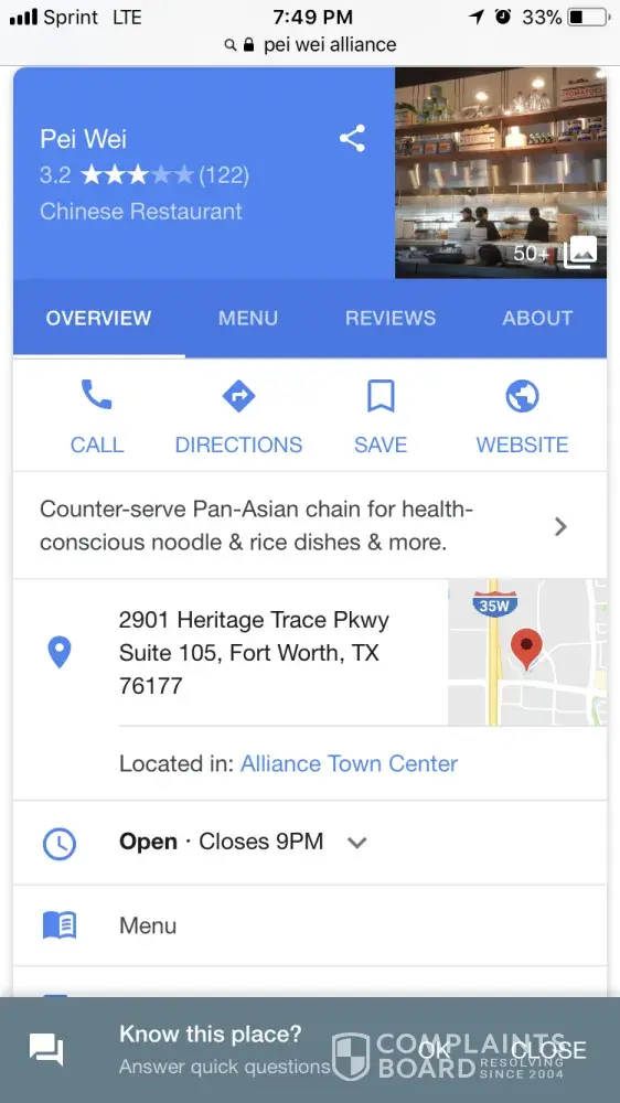 Pei Wei earns a 1.1-star rating from 0 reviews and 53 complaints, showing that the majority of diners are dissatisfied with their meals.