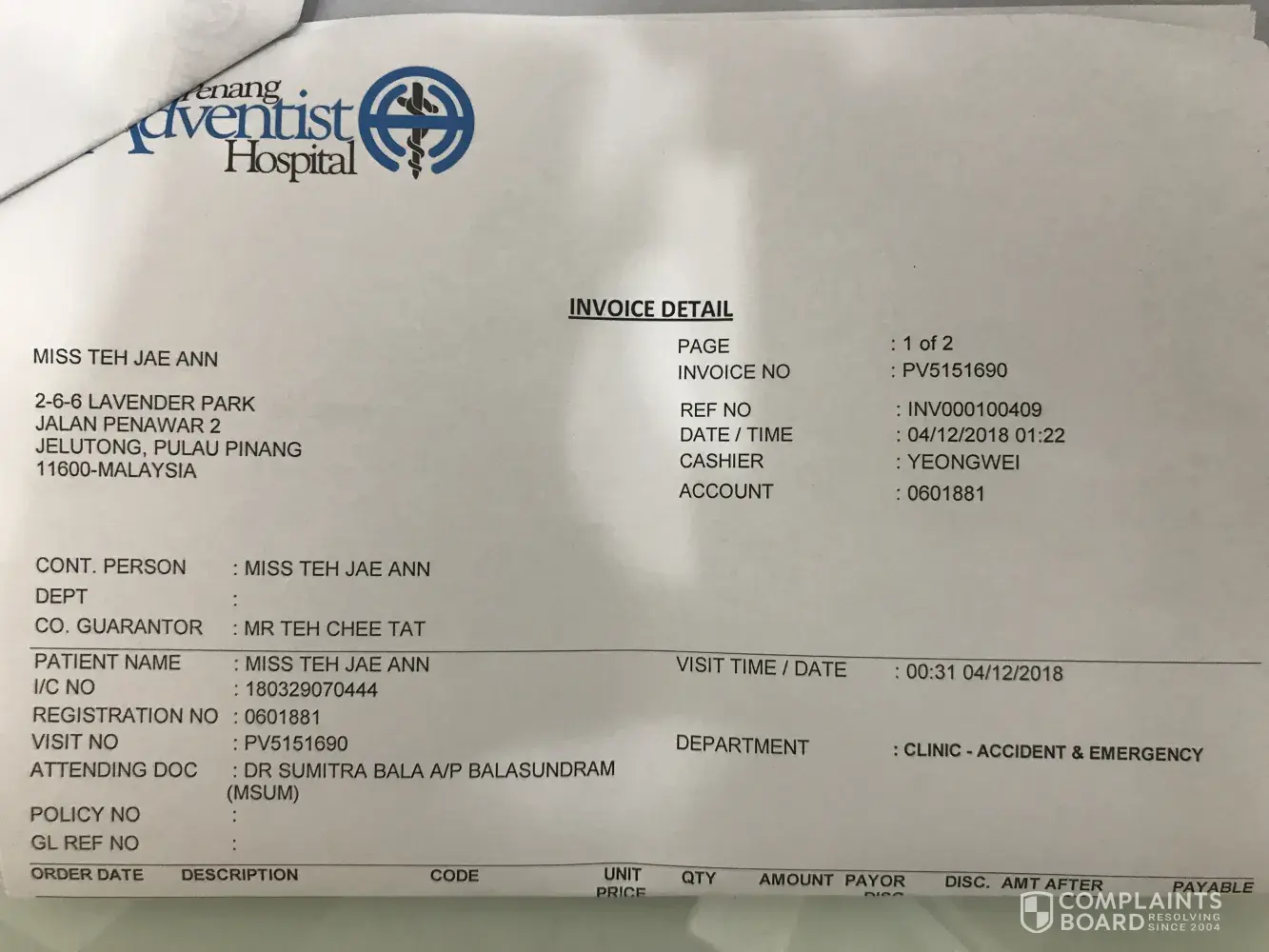 I am writing this complain to Adventist Penang Hospital. The service is very very bad.