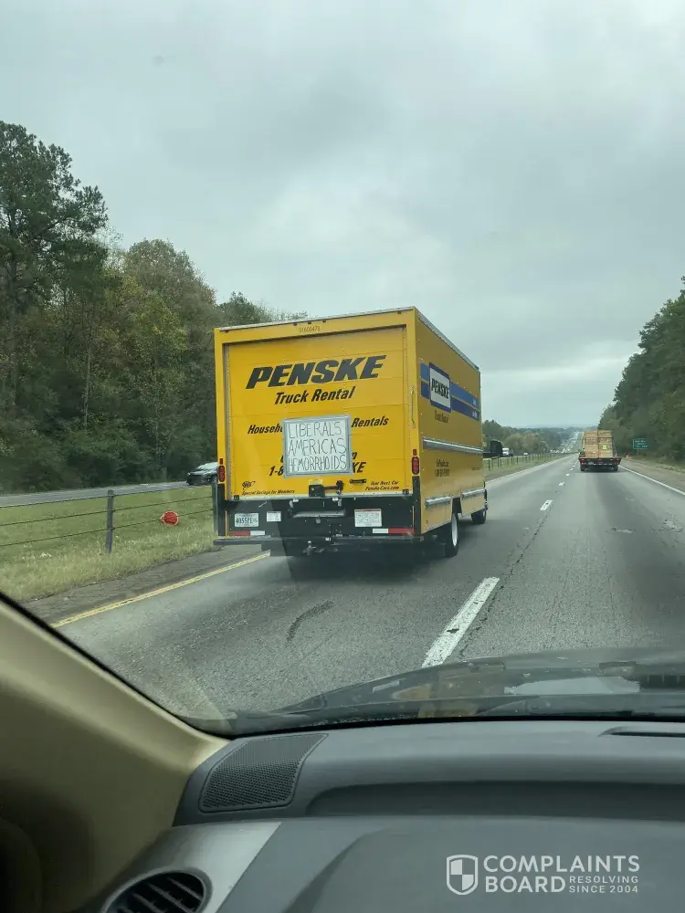 I witnessed a customer renting your truck, who attached hate speech onto the back of your rental. He rode for over an hour on the interstate with the message attached to your Penske truck: "Liberals... America's Hemorrhoids"