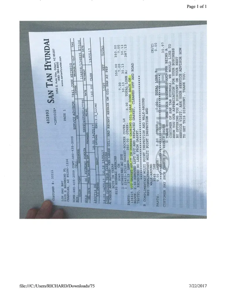 Replaced gaskets and on way out of town started leaking again ; had to keep stopping to put oil. Took to dealer in arizona ; said gasket was glued. This is a follow up complain that I send 7-22-17 but did not include pictures.