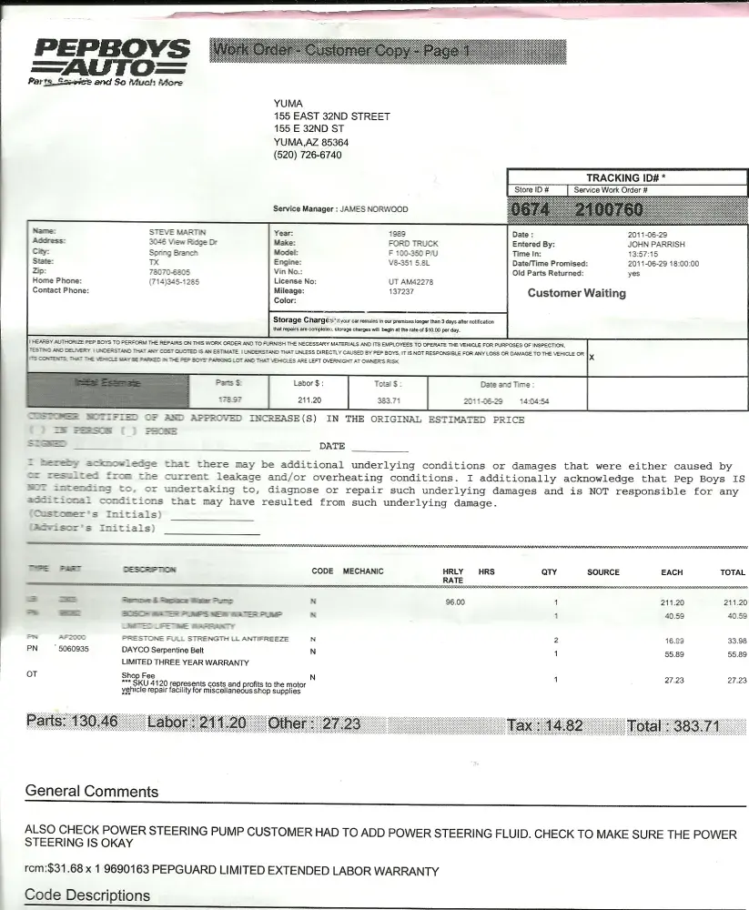 upon having a fan belt break in desert 50 miles out of Yuma had to be towed an only garage available was Pepboys, here is original quote $383.71 with final cost $910.31 8 hrs. later, MISSING BOLTS NONE HOLDING ON AIR CONDITIONING & NEW WATER PUMP BEING HELD BY SCREEN DOOR BOLTS NOT AUTOMOTIVE TYPE BOLTS purchased from Lowes Hardware per their request if we wanted to get on the road to Calif we had to go buy an pay for them, an now and rattle noise coming from engine, next day took to La Habra Ca. pepboys an they replaced all non proper bolts with proper ones @ no charge an thought work was unapproriate also, but now power steering pump leaking as well as timing chain making noise an transmission leaking
