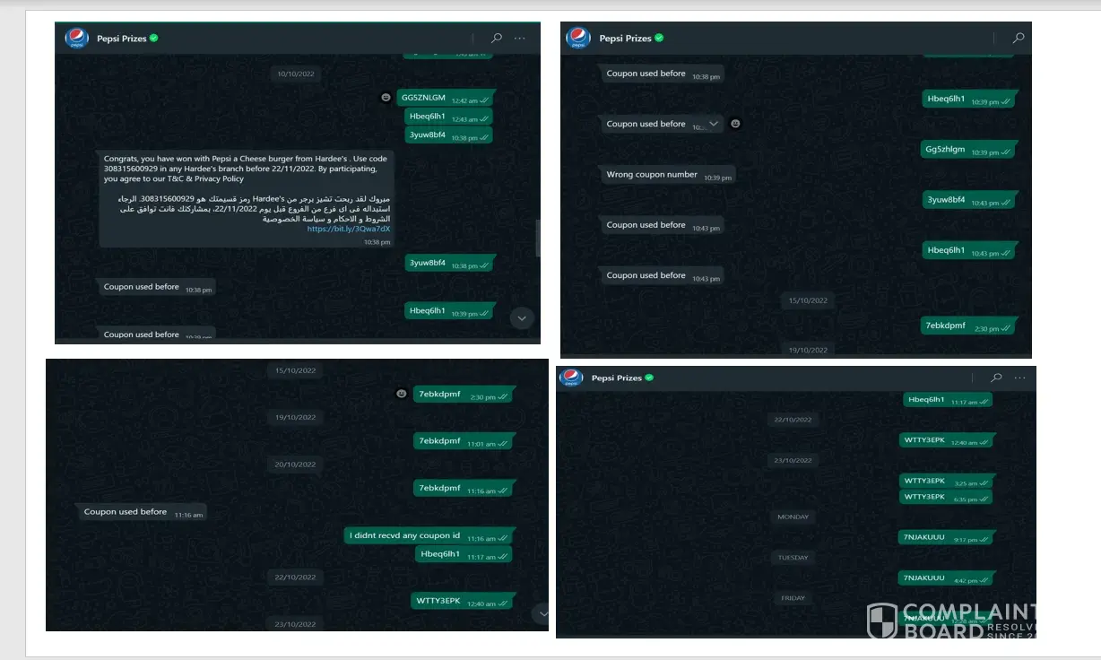 I sent 3 Code to Pesi on WhatsApp for which I should get 3 Coupon as mentioned on the bottle sticker as EVERYONE IS WINNER. Now it has stopped sending Coupons to redeem the Prize, means not even responding, at least inform that the prize is not there or stopped or any reason why we are not getting the coupons, we do have that right to know the reason of no response from Pepsi team. If it there is some change or offer is discontinued, then stop promotion in bottles too. Pepsi is reputed and big company, so it is not acceptable that the ad is still there but no offers, Fake Promotions is a cheat and fraud with Pepsi and Burger Fans. The Codes sent by me from INDIA # +91 [protected]. Codes are as: