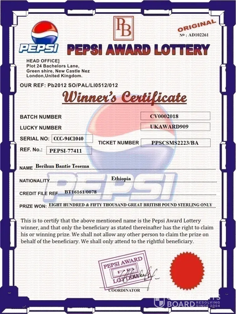 However, the 2019 PEPSI-COLA COMPANY U.K Mobile Award is no doubt, a momentous achievement in the chequered history of this Corporation. On behalf of the entire staff of the Organization, I wish to congratulate all non-Governmental Organizations who have in no little way contributed immensely towards the success of this draw as well as taking concrete steps towards it's actualization. All participants were selected randomly from World Wide Mobile Directories. This promotion is part of the financial empowerment program of the PEPSI-COLA COMPANY U.K, in it's struggle to alleviate poverty.