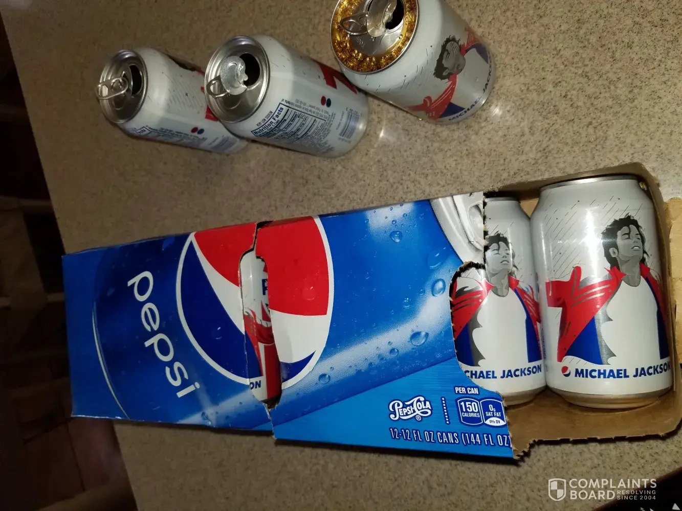 I am a 67 year-old retired Senior and I live on St. Thomas, U.S. Virgin Islands. I recently purchased a 12-pack of Regular Pepsi, Michael Jackson edition. When I opened the first can it made a very loud pop like a gun shot. My husband ran to the kitchen; Pepsi spilled all over the counter. See picture of first can. A few days later I opened a second can; same thing happened but this time the tab bruised by hand; see picture. When opening a third can I placed a folded piece of paper towel over top of can. Same thing happened and Pepsi spilled. See picture of three cans; look at the tabs. Today I opened the fourth can but this time I did a video, attached. As you will see same thing happened, loud pop and Pepsi spilled. I have attached a picture of the12-pack and picture of proof of purchase information. This is a dangerous situation. I am concerned that something serious can happen to other customers. What causes this? I look forward to a prompt response. Thank you.