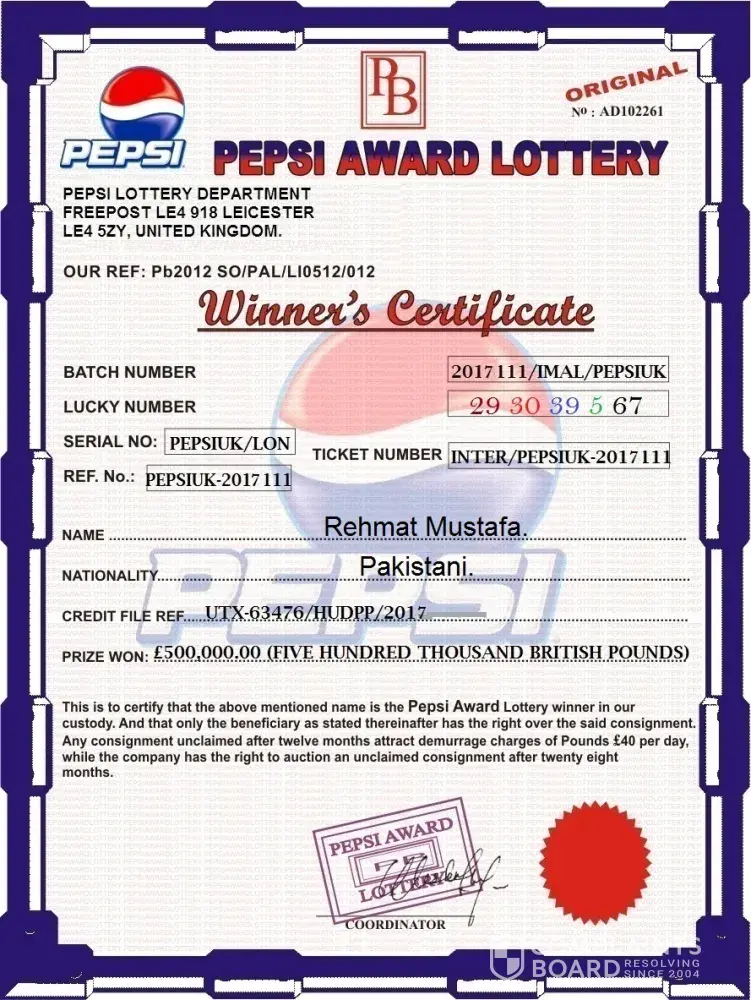 We acknowledge the receipt of your mail with regard to the sms which was sent to your mobile. you have been awarded gbp500, 000.00 (five hundred thousand great british pounds sterling) in the 2017 pepsi international mobile draw held in united kingdom.