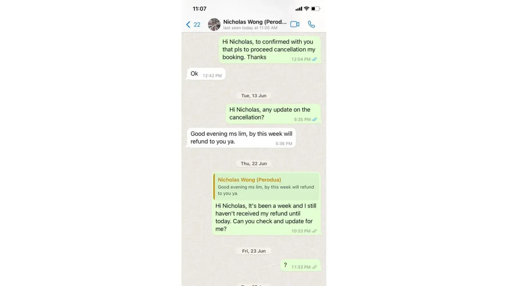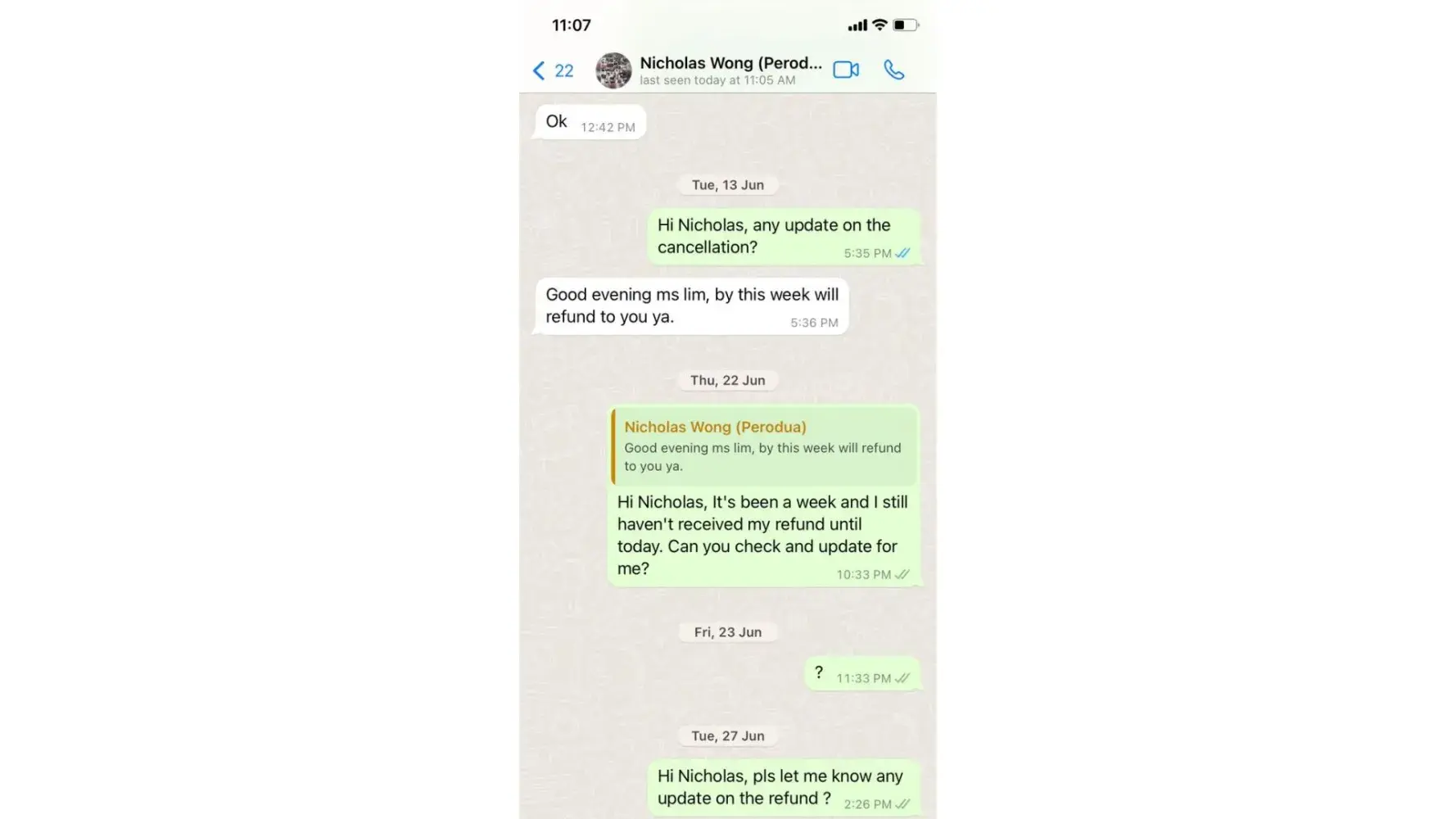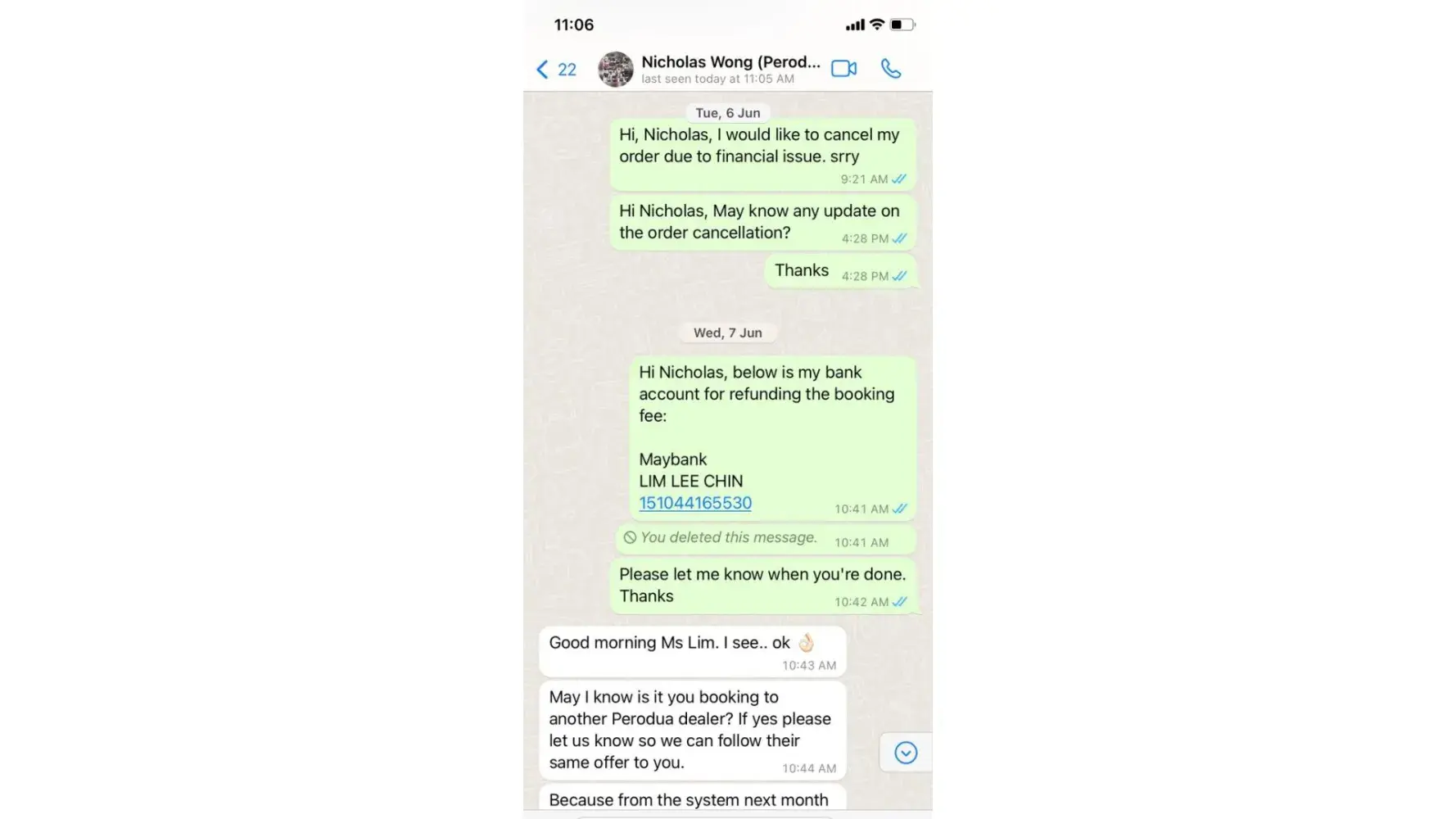 On 16/05/2023, I placed an order ATIVA 1.0X at Showroom Perodua Kinrara Puchong, 40G Plaza Kinrara, Jalan Puchong Mesra, 58200 Puchong, Wilayah Persekutuan Kuala Lumpur from Mr Nicholas Wong. Unfortunately, due to unforeseen circumstances, I had to cancel the order on 06/06/2023. I was informed that a refund would be processed within 13-18/06/2023.