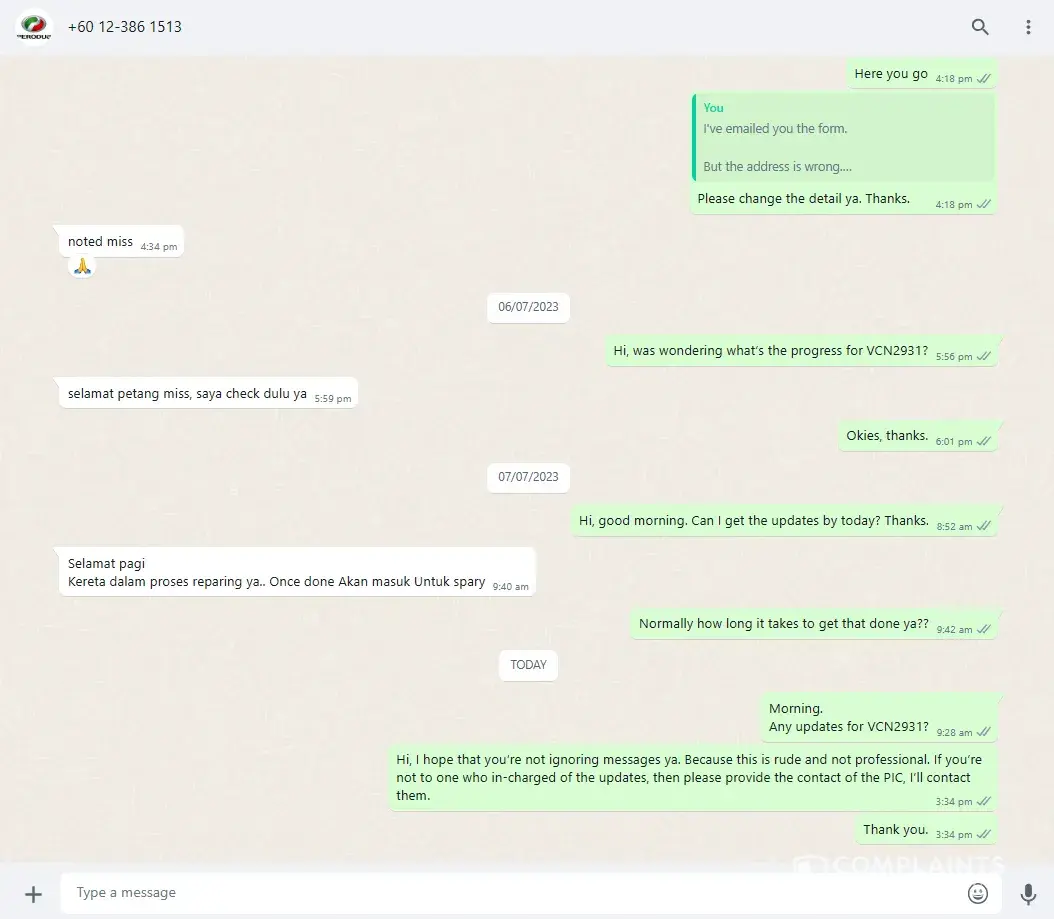 Hello. I would like to file a complaint regarding Perodua Unresponsive Sales Advisor from Ngu Chu Beng & Sons Corporation Sibu. Her details and our screenshot are enclosed as the evidences.