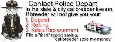 I bought a 12 wk kitten from this same breeder (July 11, 2010) he weighted 1.14 lbs. The fur on the end of his tail was sparce, I thought it was because he chewed it while playing. After a months time the fur was missing a good inch and a half on his tail as well as a patch on his head. I brought him to my vet mid August. My kitty was diagnosed with Giardia and Ringworm. When I told the breeder she said he got the Giardia from tainted water at my house, my cats get bottled water. Interestingly enough the breeder had her house water tested and put the entire cattery on the same med my vet perscribed. Hmmm... The vet also said that the ring worm came from the cattery since he was able to see another spot on the head where the fur had fallen out and regrew. Since I had the kitten for 4wks that is impossible for fall out and regrowth to happen in that short a time without being noticed by myself. My older cat was tested for Giardia and Ringworm and she came back negative so it did not come from her. When the breeder was told she offered to help pay for the medication for ringworm but has yet to send any money. I sent her the packing slip/receipt and she claims she doesn't have my address. Packing slip and my check that she photo copied has my address...This breeder is un willing to accept her kittens are not in the best of health and grossly under weight. My kitten has been treating for ringworm for the past 3months, 4 script @ $50 a script not to mention the vet bills. My kittie is now 7 months and at a normal weight Vet quote "He certainly is a much healthier kitten than when he first came in." I love my kittie and would not give him up for the world, he is happy and loved. Buyer beware from this breeder. She does not accept responsibility for her lack of proper care to her kittens. She has tooo many litters (7 litters when mine was born) to give the proper care and attention each kitten needs to insure a healthy kittie. BUYER BEWARE!