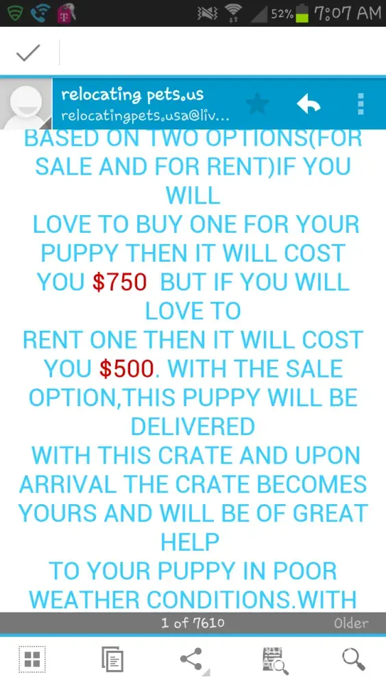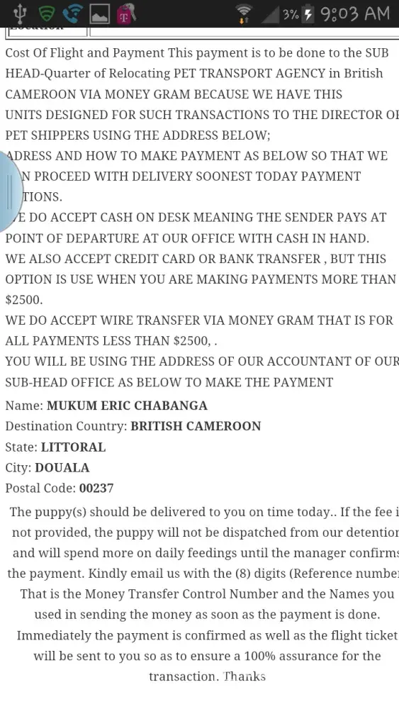 Contacted by Unique Transport Service the next day to arrange shipment and payment. But I fell for the scam and sent the 420.00 for cost of puppy and shipping to Cameroon. Just to trusting. When the shipping company emailed and called me the next day, when the puppy was to be delivered, They said the puppy was in quarantine and I would need to send a money order of 1920.00 to pay for 48 hrs of insurance before they would release the puppy. But that money would be refunded when puppy arrived at my door. When I questioned this they hung up. The "owner" then text me about how worried they were that their baby was in quarantine and I needed to do something ASAP to continue the transaction.