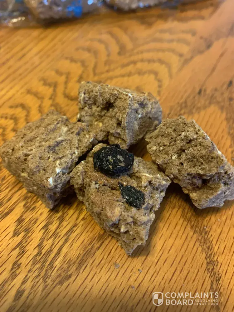 I picked up a 1 pound bag of granola treats for our golden retirever. When we got home and broke one open we realized these treats have raisins in them. I called the store and they insisted it was a blueberry. I tried one because I didn't believe this was the case, and it is a raisin. (the recipe is like a cinnamon raisin granola). I will not be giving...