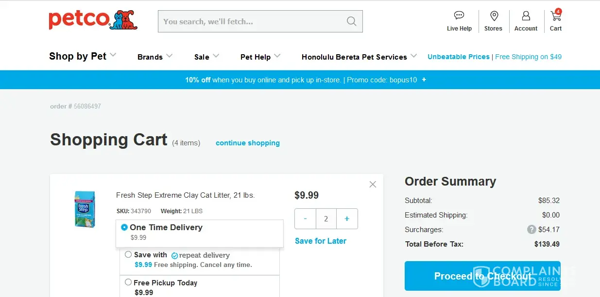 I've been an online Petco customer for a couple years and was always happy. But today I was going to order a $27.99 bag of cat litter, and saw they want to charge me $33.49 in surcharges - this along with $5.99 shipping in handling. Completely absurd considering it would be shipped from a local store and delivered by USPS.