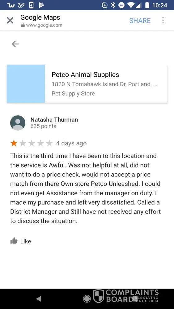 This is the third time I have been to this location and the service is Awful.Was not helpful at all, did not want to do a price check, would not accept a price match from there Own store Petco Unleashed. I could not even get Assistance from the manager on duty. I made my purchase and left very dissatisfied. Called a District Manager and Still have not received any effort to discuss the situation.