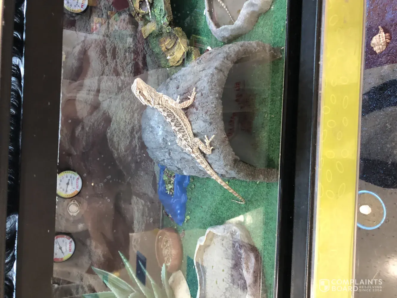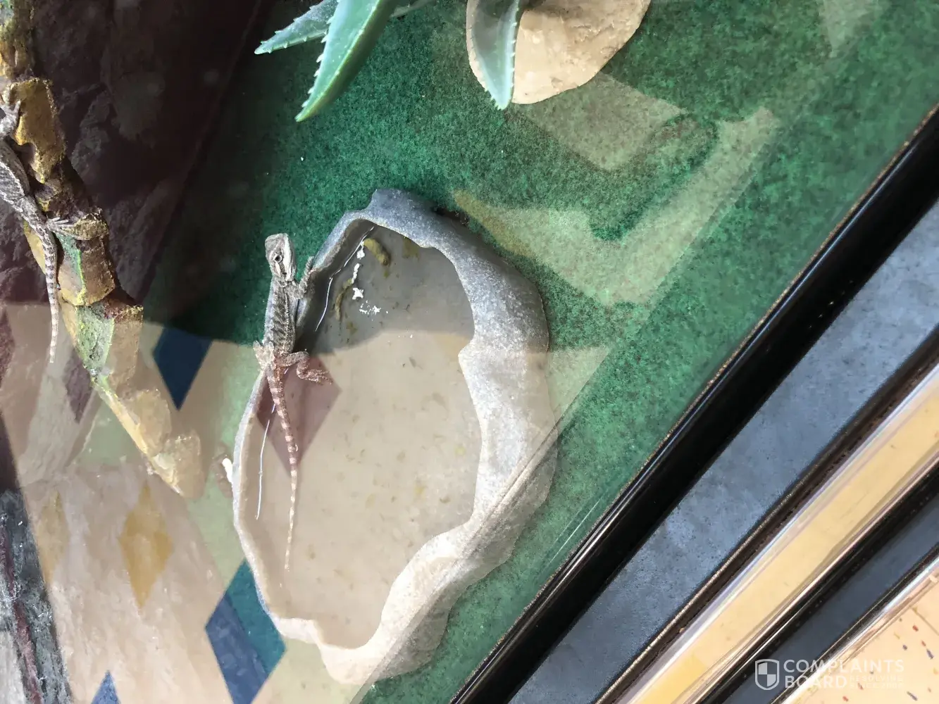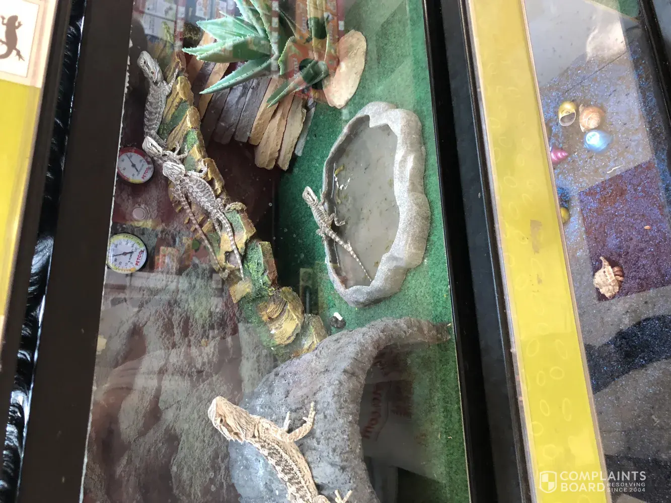The bearded dragons had poop all in their water, not the right food, and the babies and adults should not be in the same habitat. There was a roach crawling across the store floor
