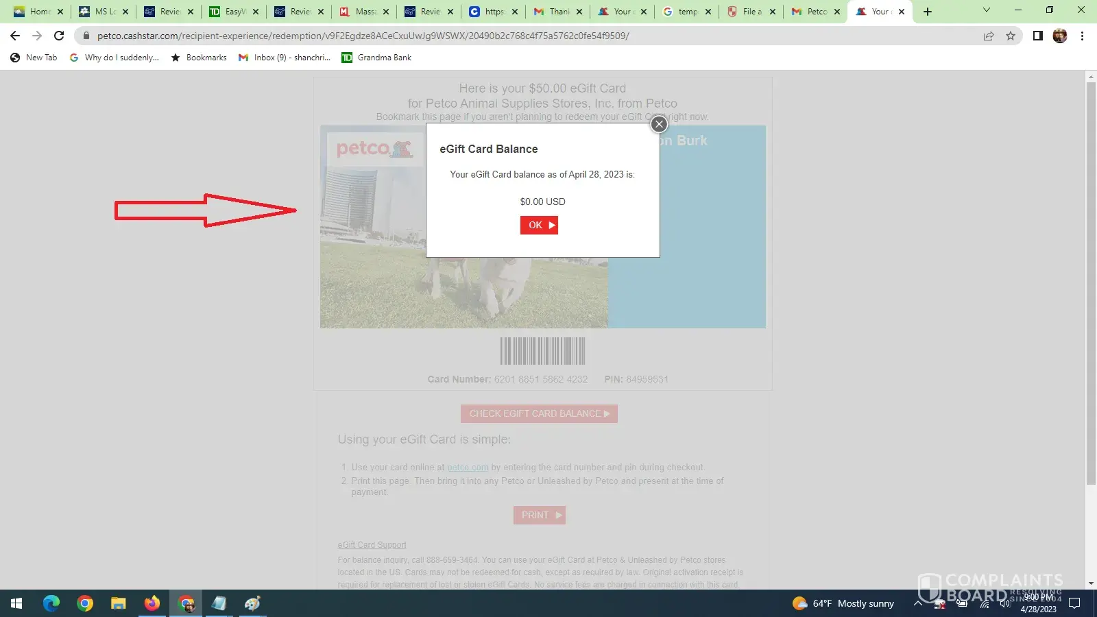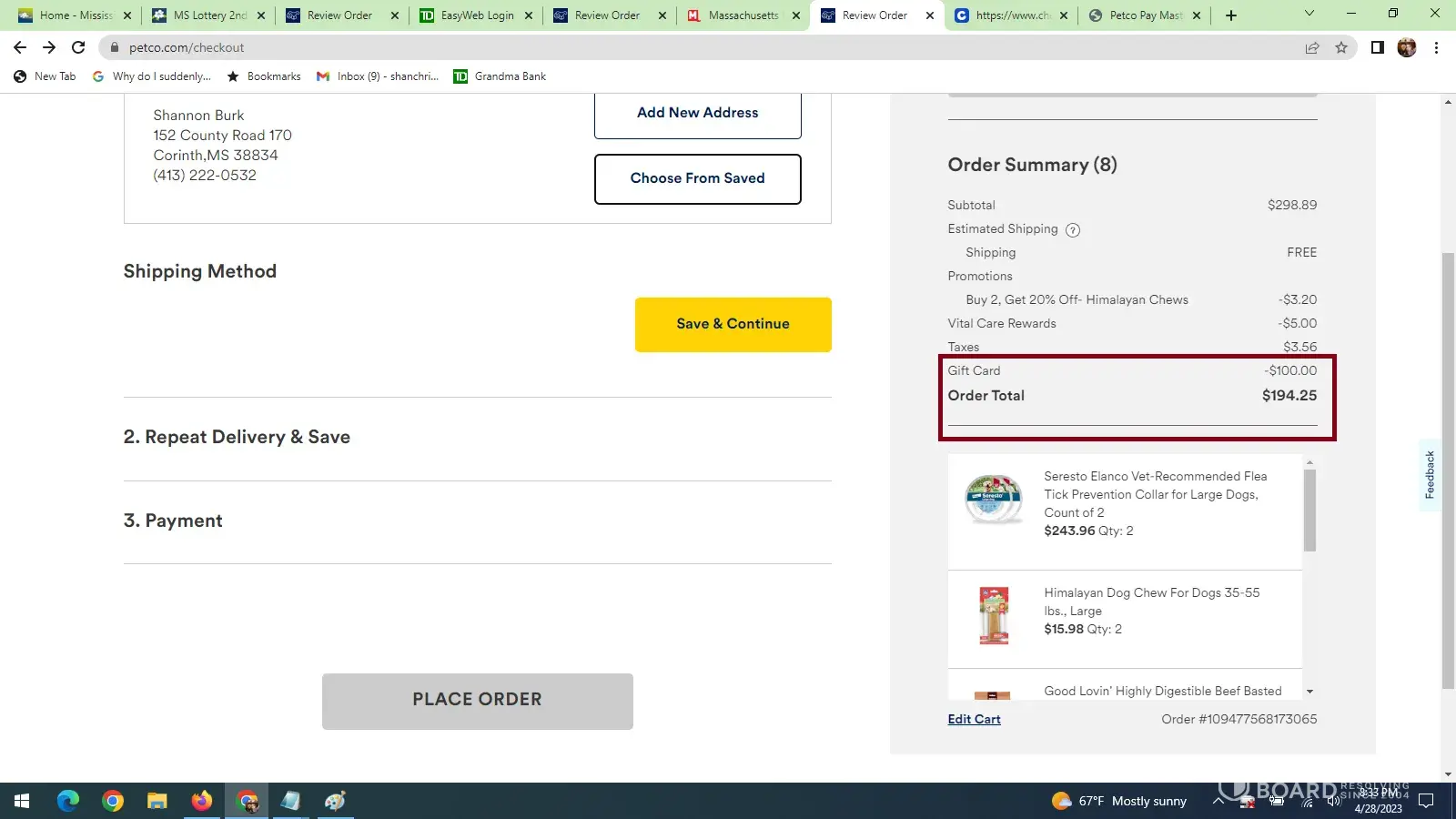 On 4/27/2023 I placed an order at Petco on line. During that order I was asked if I wanted to save 20% by signing up for a Petco master card - I said yes and signed up. I was sent a txt message stating that the temporary card was sent and would last 24 hours. I tried to place the order and got an error that the credit card authorization failed and to call Customer Service. I called and was told by the person that I needed to wait 24 hours and that it would work and they assured me that it would work and I would have my discount. I waited till 24 hours later on 4/28/2023 (TODAY) and tried again and there is no discount - so I call the customer service number. I end up being transferred 6 times during this call and finally get to a supervisor who assures me all will be good. She sent me a gift card to make up for the lost 20% from signing up for that card that no one can seem to make happen. This is perfect! So my order would be originally $298.89 but with the gift card the supervisor sent me and the gift cards I had plus my vital care awards the amount should be $194.25 so I am happy with this and click place order with a different card because the one Petco has given me is not working and when I get the receipt it shows that the amount charged to my account is $298.89 and my gift cards are now a ZERO! Petco has stolen over $100 from me and I would like this refunded immediately. I have all the proof as I kept all the screen grabs and you can listen to the calls I was on the phone with your people for 1 hour 16 minutes and 2 seconds today!. I am completely UNHAPPY in how this has all transpired. Please fix this immediately.