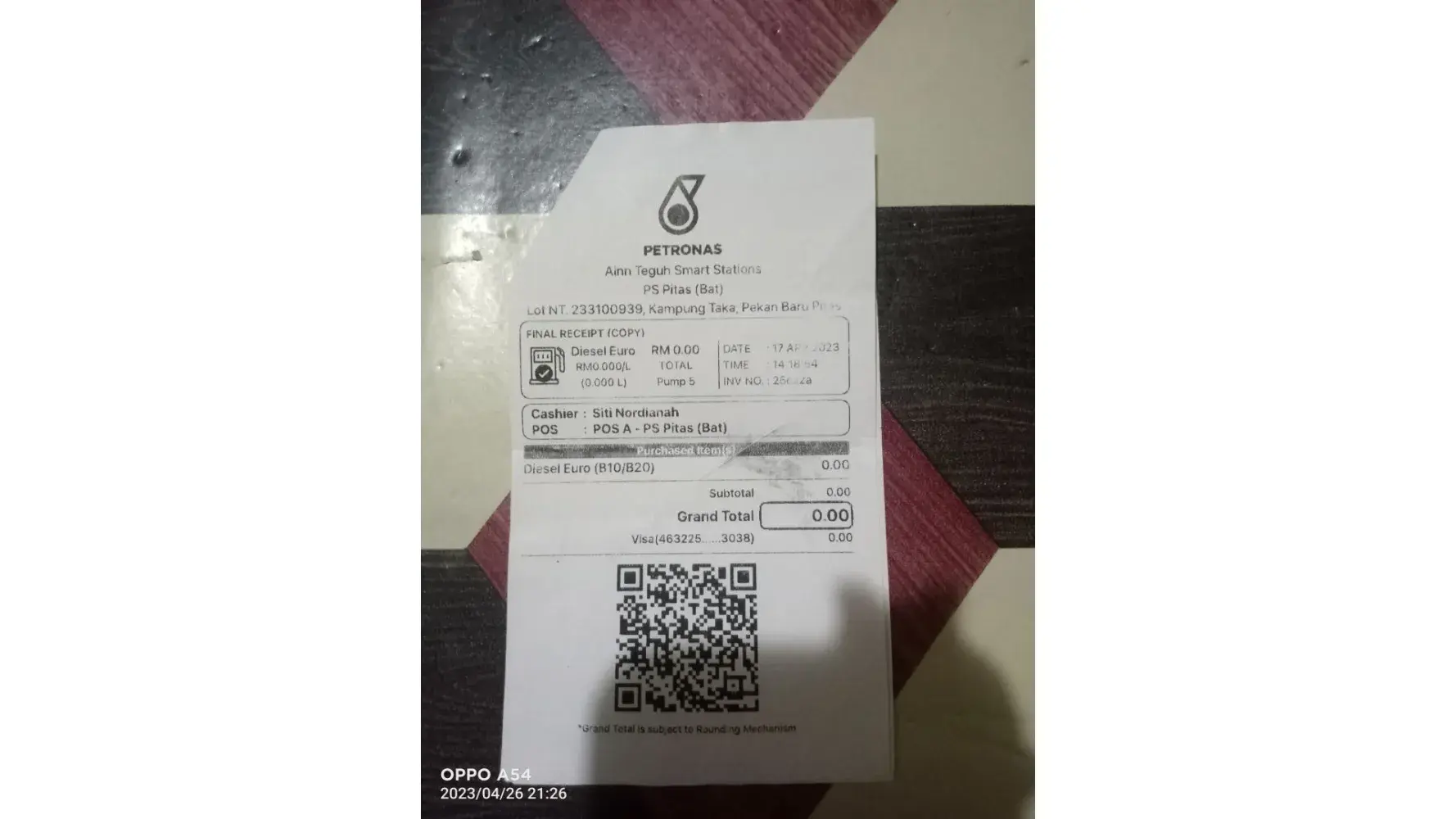After paying and the receipt from the Cashier (Ahmad Naim Bin Shaari) and found out the point was not displayed in it. I went back the counter and look for the cashier and ask about my point, and he said there was no point in the receipt, and took my card to print the point. I come often to this petrol station and wonder why it doesn't show up in the receipt?