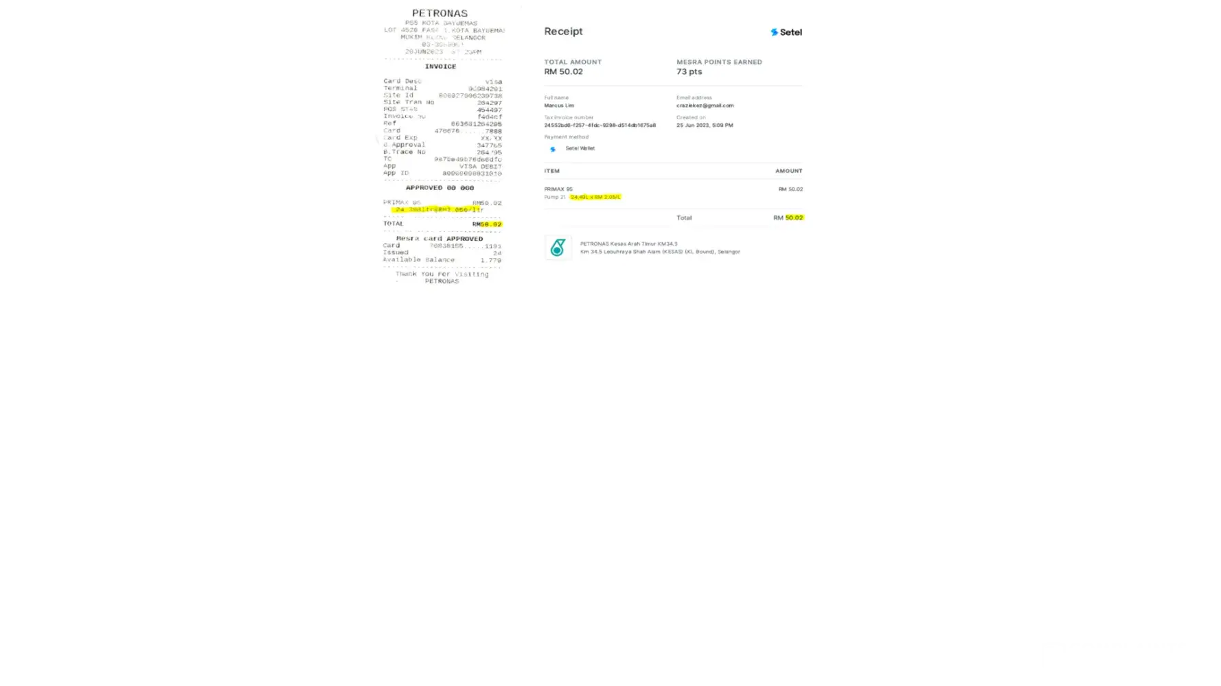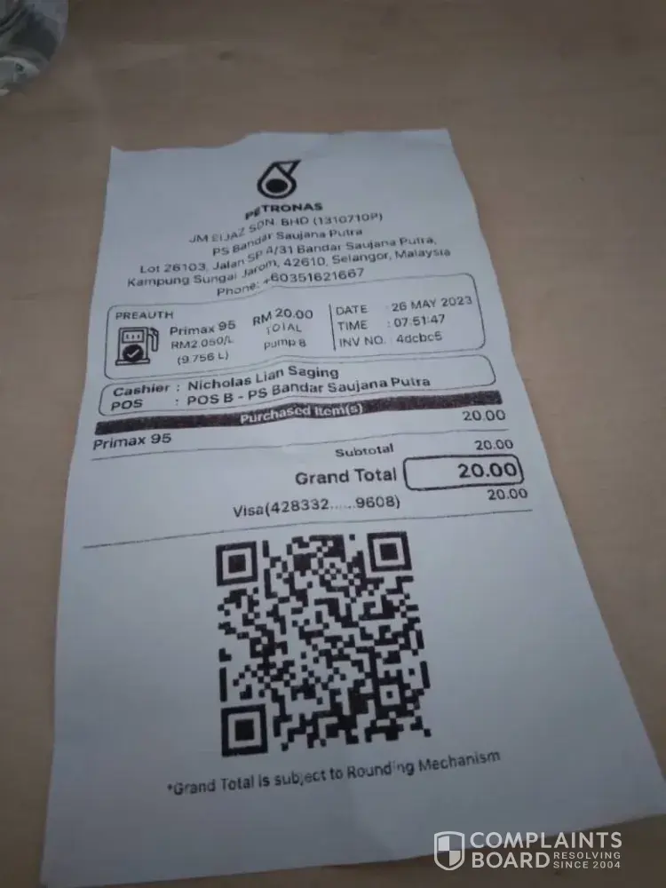 Hi Great Petronas, Kindly look into it on 20th Jun i paid RM 50.02 worth of fuel.