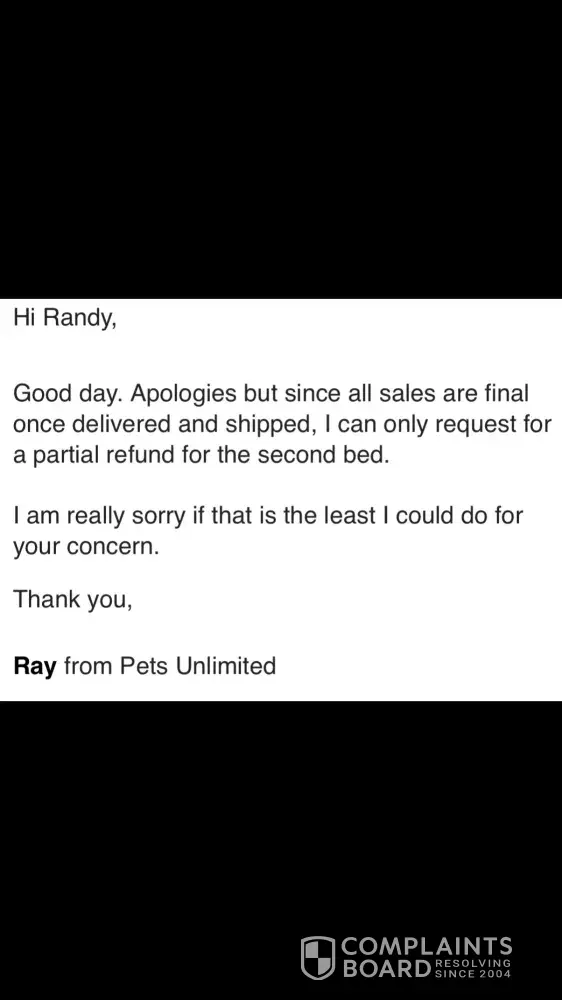 I purchased from their facebook ad BOGO for dog beds and never received my order. I emailed asking for an update on the status and was told the color I ordered was on back order, but would be in later the following week and they would ship them out. Week went by no email, or tracking number from them. I asked for another update and John replied with a typical sorry for the delay response. Months have now gone by now and I have sent emails asking for a refund and have been told that the refund team will send me an email when it is processed in 24-48 hours, and I have still received nothing. Nothing showing in my bank account for a refund, no product delivered, and now no replies to my emails asking for refund. This company is a scam and should not be allowed to continue scamming people. I have copies of all my emails with John from Pets Unlimited too.