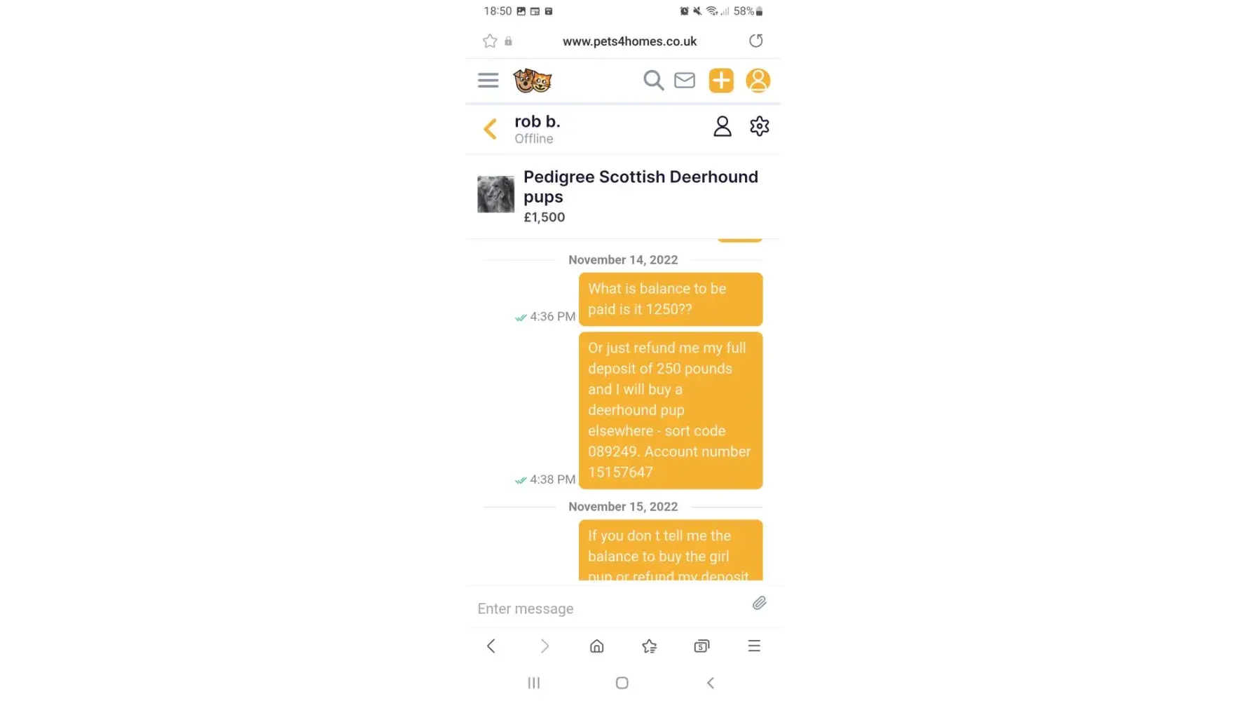 Desired outcome: Full immediate refund of deposit of 250 and Pets4Homes to take a closer look at their customer safety and an explanation and apology